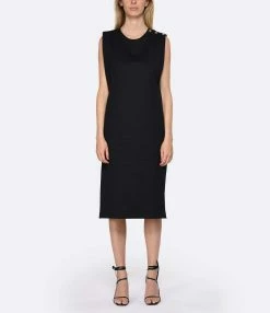 Robe mi-longue noire sans manches. Fentes latérales en bas. Fermeture par trois boutons métalliques dorés à l’épaule. Col rond. Coupe droite. Base droite.