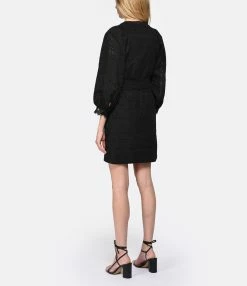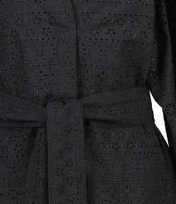 Robe courte brodée en coton noir. Manches 3/4 avec finition en dentelle. Deux poches prises dans les coutures. Coupe droite. Base droite. Ceinture amovible à la taille. Doublée.