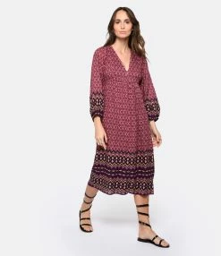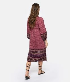 Robe longue en coton mélangé imprimé à motifs géométriques dans des tons roses. Col en V. Épaules froncées. Manches longues avec poignets resserrés. Fermeture zippée invisible latérale. Coupe ample. Base droite. Doublée.