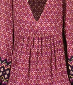 Robe longue en coton mélangé imprimé à motifs géométriques dans des tons roses. Col en V. Épaules froncées. Manches longues avec poignets resserrés. Fermeture zippée invisible latérale. Coupe ample. Base droite. Doublée.