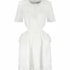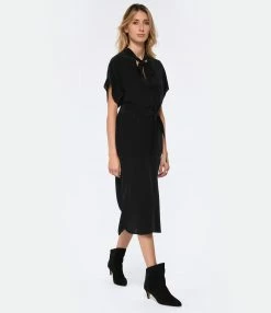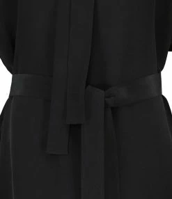 Robe mdi en soie mélangée noire. Col en V avec liens à nouer. Manches courtes. Coupe large. Base arrondie. Non doublée.