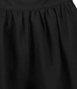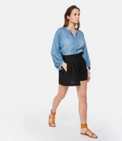 Short noir fluide. Fermeture par zip sur le côté. Deux poches à l’avant. Fronces au niveau de la taille. Coupe cintrée ample. Base droite.