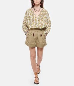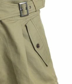 Short en coton kaki. Ceinturé à la taille sur le coté. Poches boutonnées à l’avant et une poche passepoilée à l’arrière.