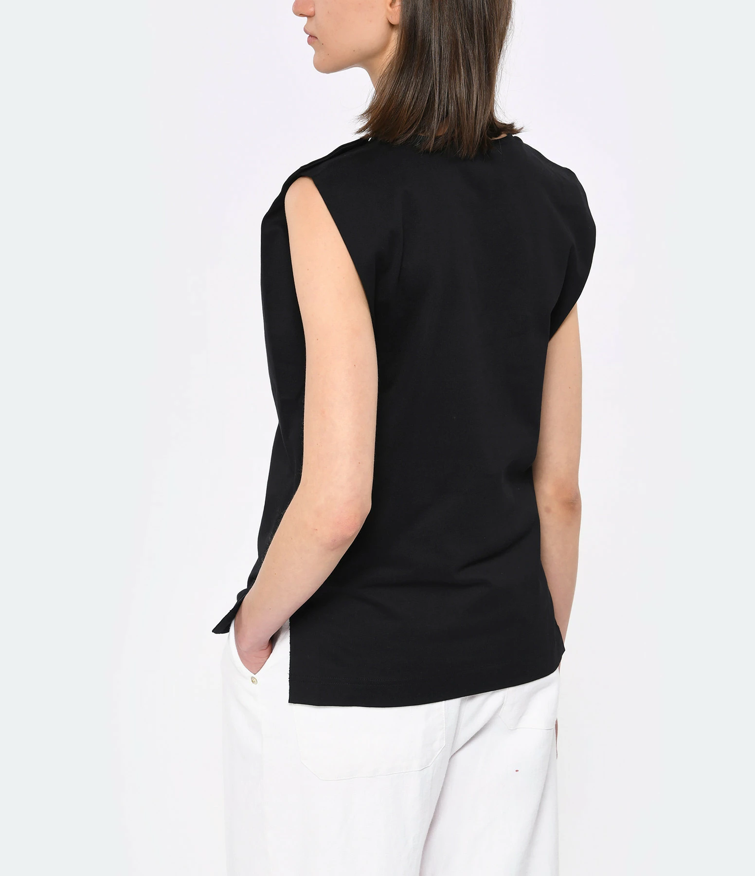 Top en coton noir. Col rond. Sans manches. Fermeture par trois boutons métalliques dorés sur l’épaule.