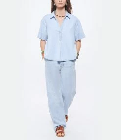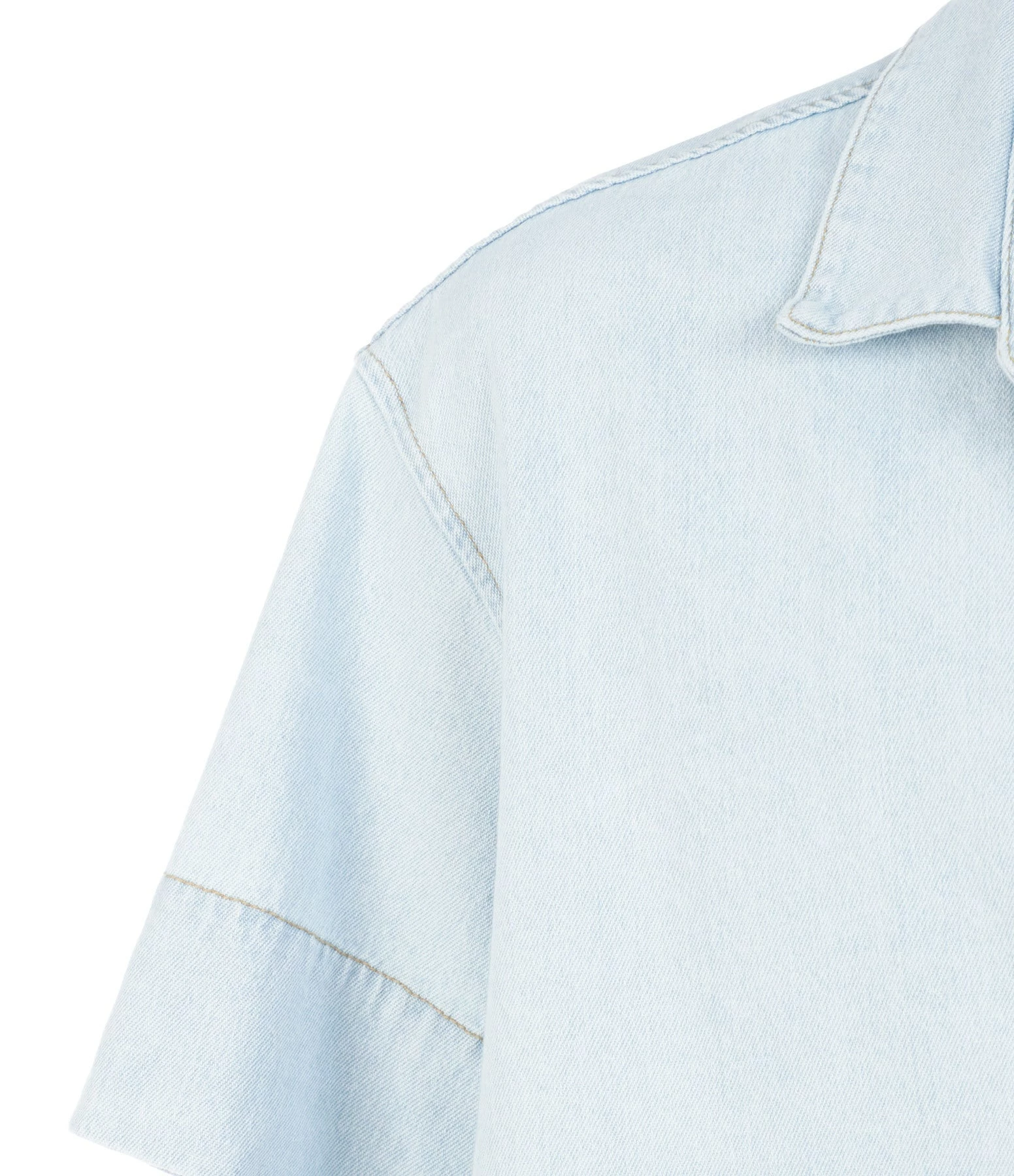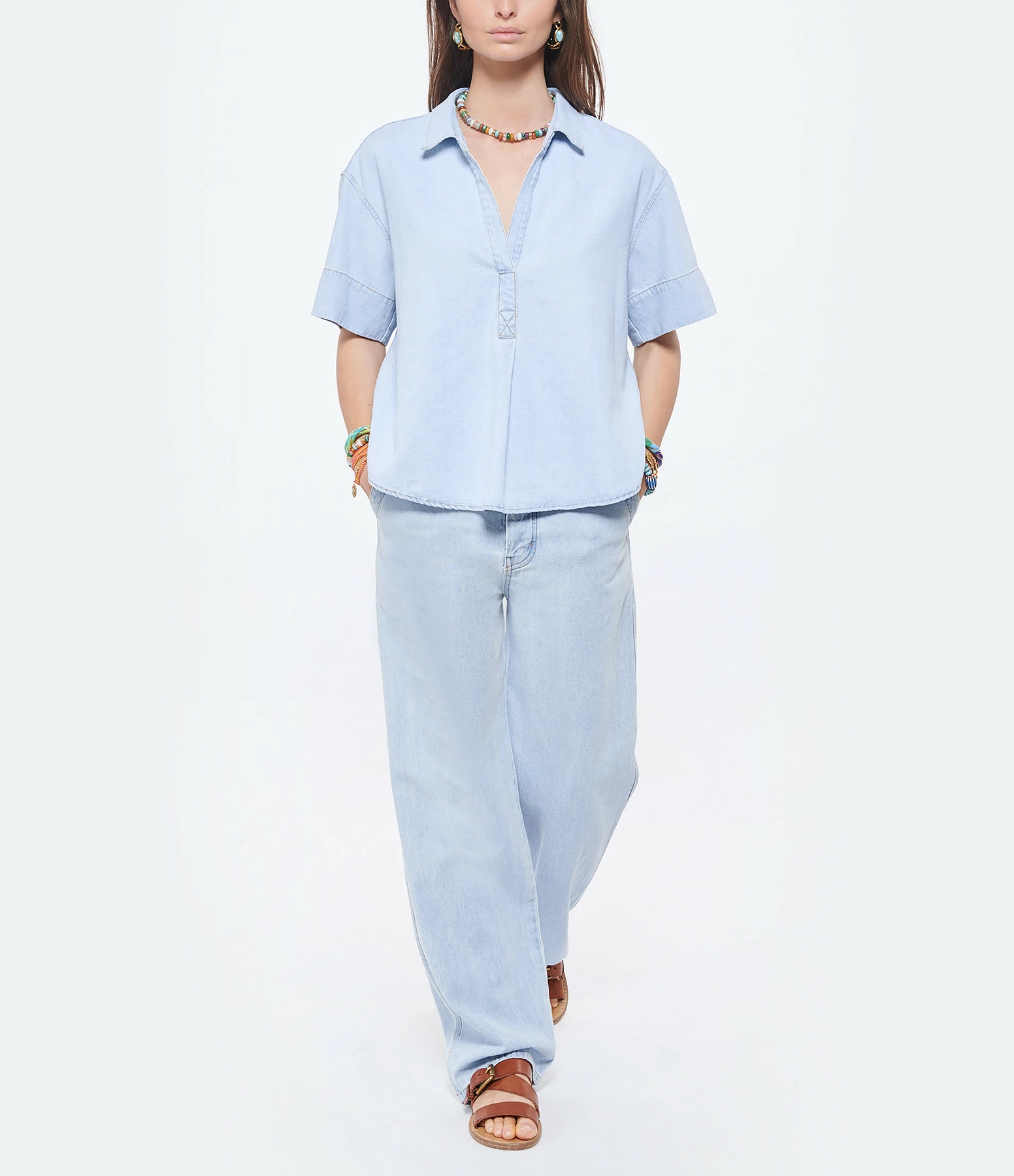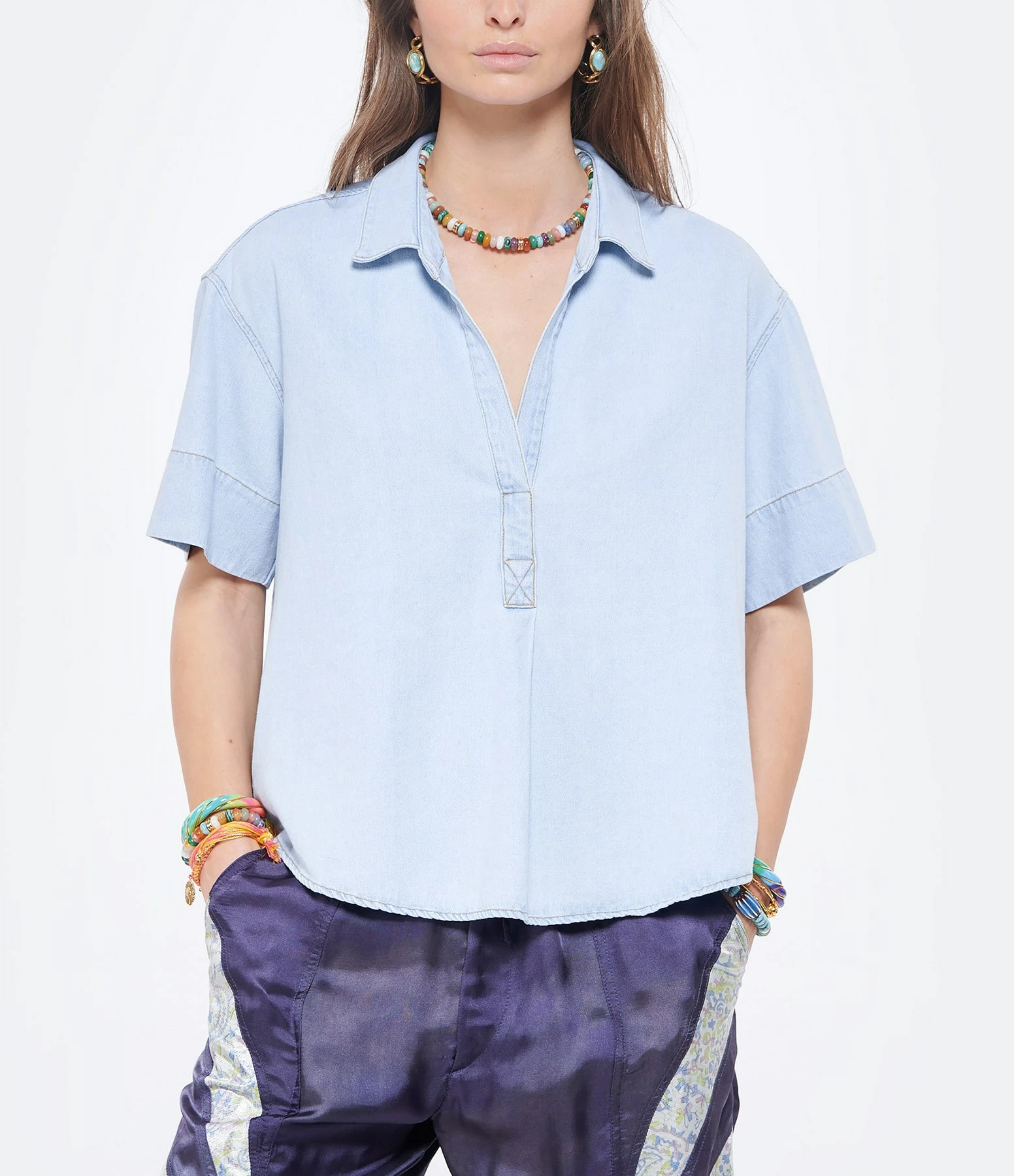 Blouse en denim bleu clair à manches courtes. Col chemisier. Encolure tunisienne. Plis au dos. Coupe ample. Base arrondie.