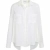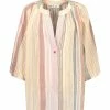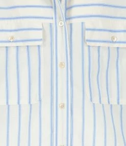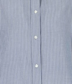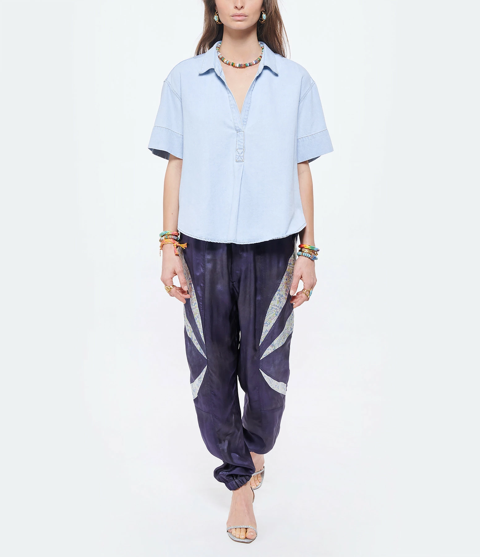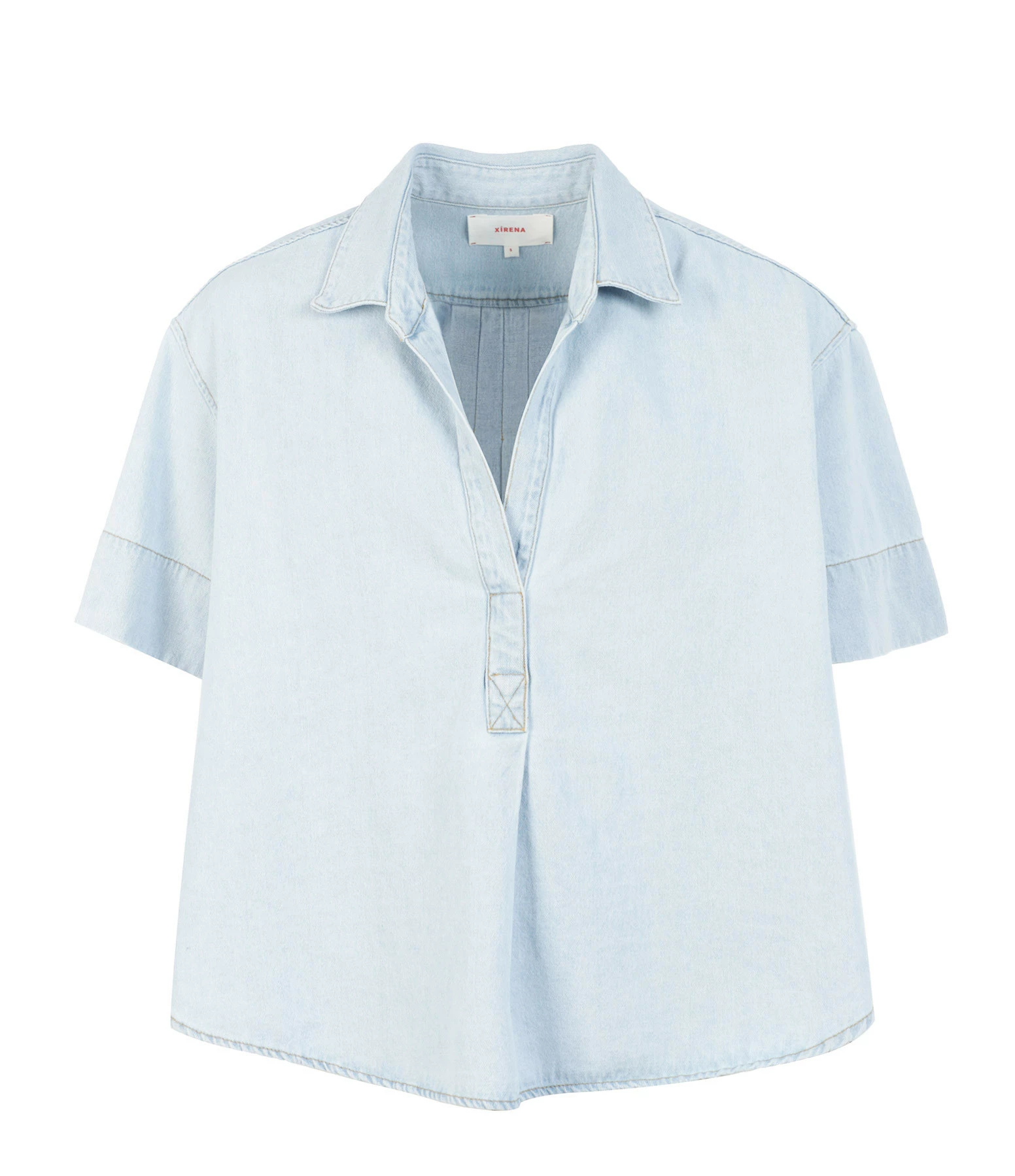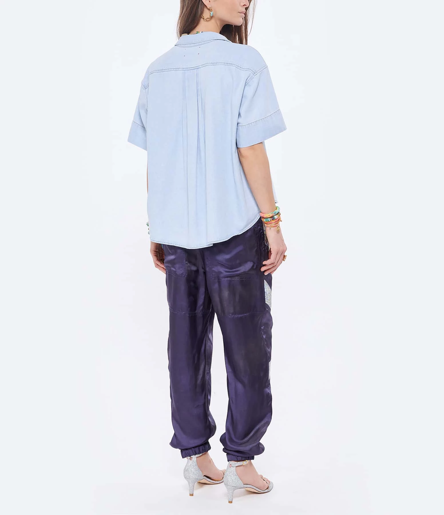 Blouse en denim bleu clair à manches courtes. Col chemisier. Encolure tunisienne. Plis au dos. Coupe ample. Base arrondie.