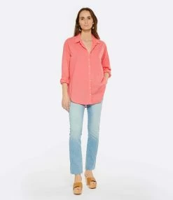 Chemise longue en coton corail. Col chemisier. Manches longues avec fentes et poignets boutonnés. Fermeture boutonnée sur le devant. Boutons blancs. Coupe droite ample. Base arrondie plus longue à l’arrière.