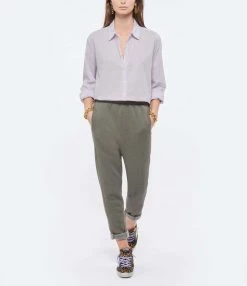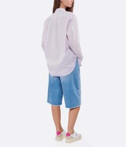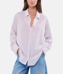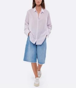 Chemise en coton lilas. Col chemisier. Manches longues. Fermeture boutonnée. Coupe droite. Base arrondie.