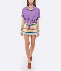 Chemise en coton violet. Col chemisier. Manches courtes retroussées. Fermeture par boutons. Coupe droite. Base arrondie.