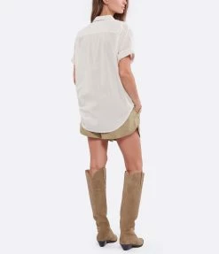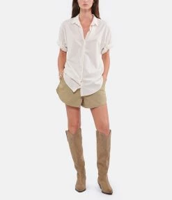 Chemise beige clair en coton. Col chemisier. Manches courtes retroussées. Fermeture par boutons. Coupe droite. Base arrondie.
