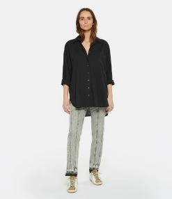 Chemise en coton noir. Col chemisier. Manches longues avec fentes et poignets boutonnés. Fermeture boutonnée sur le devant. Boutons blancs. Une poche plaquée poitrine. Fentes latérales en bas. Coupe droite ample. Base arrondie.