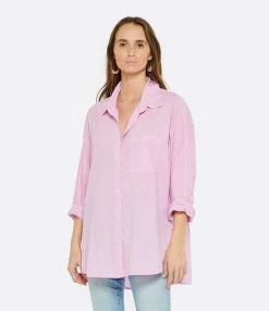 Chemise en coton rose. Col chemisier. Manches longues avec fentes et poignets boutonnés. Fermeture boutonnée sur le devant. Boutons blancs. Une poche plaquée poitrine. Fentes latérales en bas. Coupe droite ample. Base arrondie.