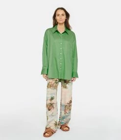 Chemise en coton vert. Col chemisier. Manches longues avec fentes et poignets boutonnés. Fermeture boutonnée sur le devant. Boutons blancs. Une poche plaquée poitrine. Fentes latérales en bas. Coupe droite ample. Base arrondie.