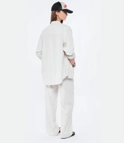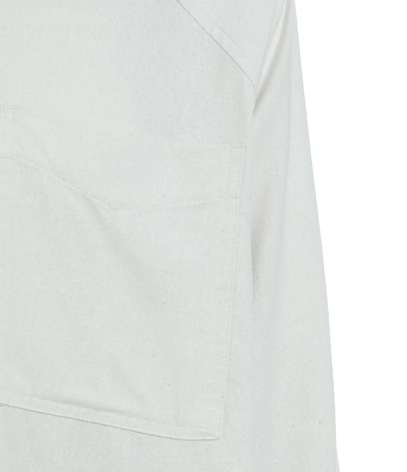 Chemise en soie écrue. Col chemise. Manches longues. Fermeture boutonnée. Une poche plaquée sur la poitrine et deux poches passepoilées en biais. Coupe droite. Base arrondie.