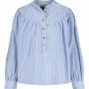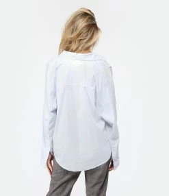 Chemise en coton bleu ciel. Col chemisier. Manches longues avec fentes et poignets boutonnés. Fermeture boutonnée sur le devant. Boutons blancs. Coupe droite ample. Base arrondie plus longue à l’arrière.
