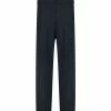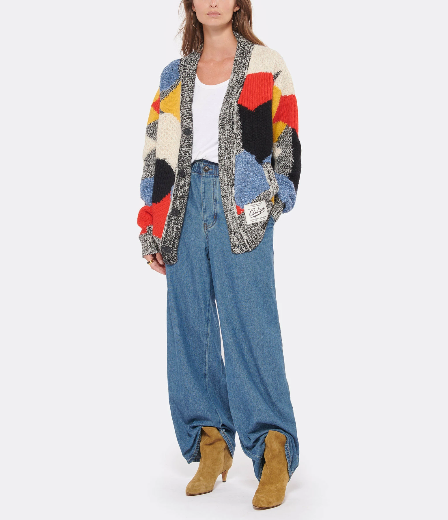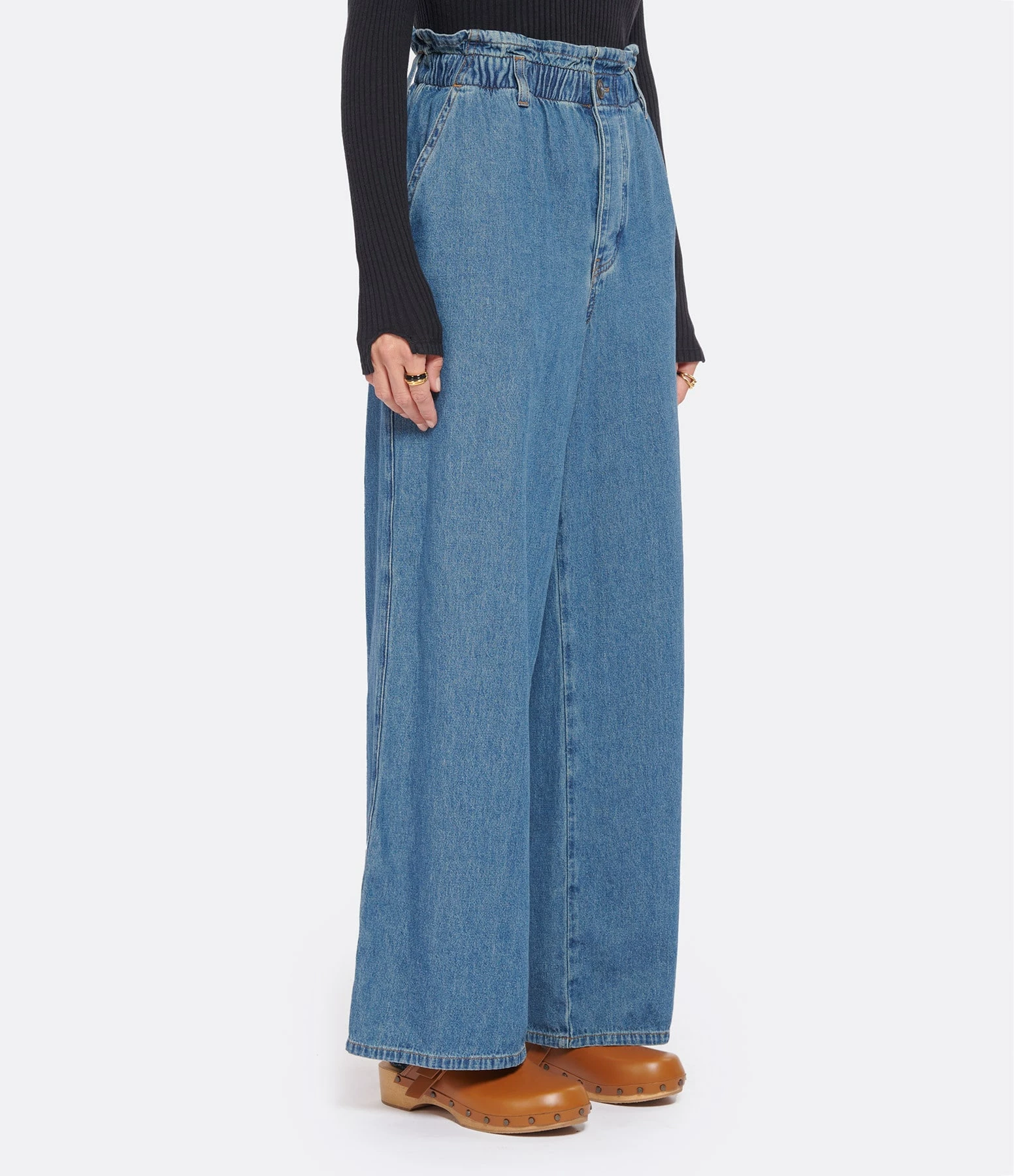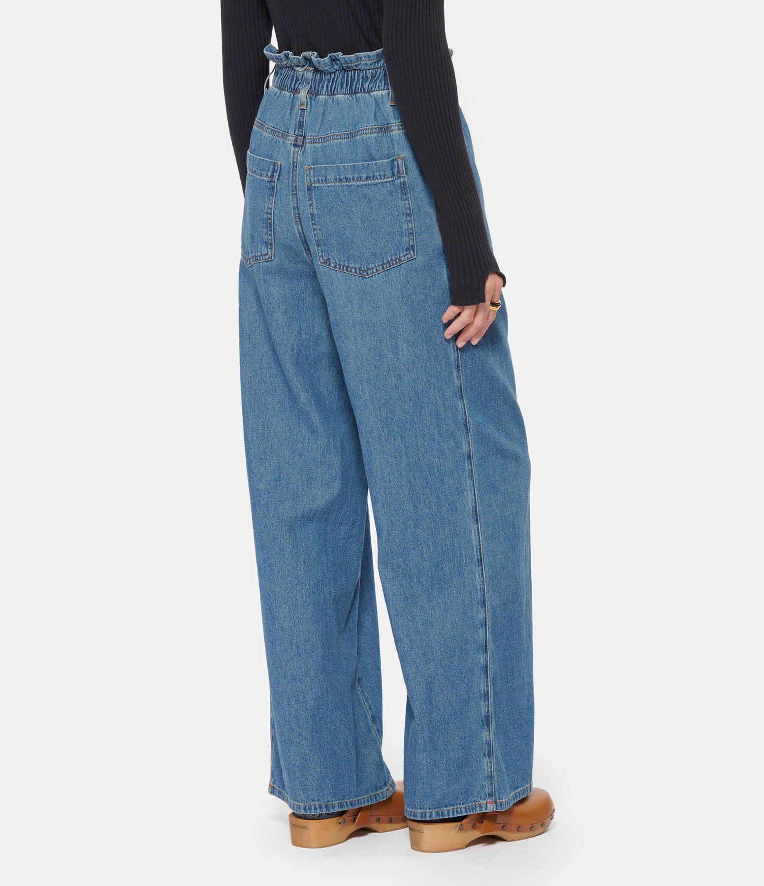 Pantalon en denim de coton bleu. Taille élastiquée et froncée avec passants pour ceinture. Fermeture boutonnée sur le devant. Boutons marron effet corne. Deux poches italiennes sur le devant. Deux poches plaquées dans le dos. Coupe large. Base droite.