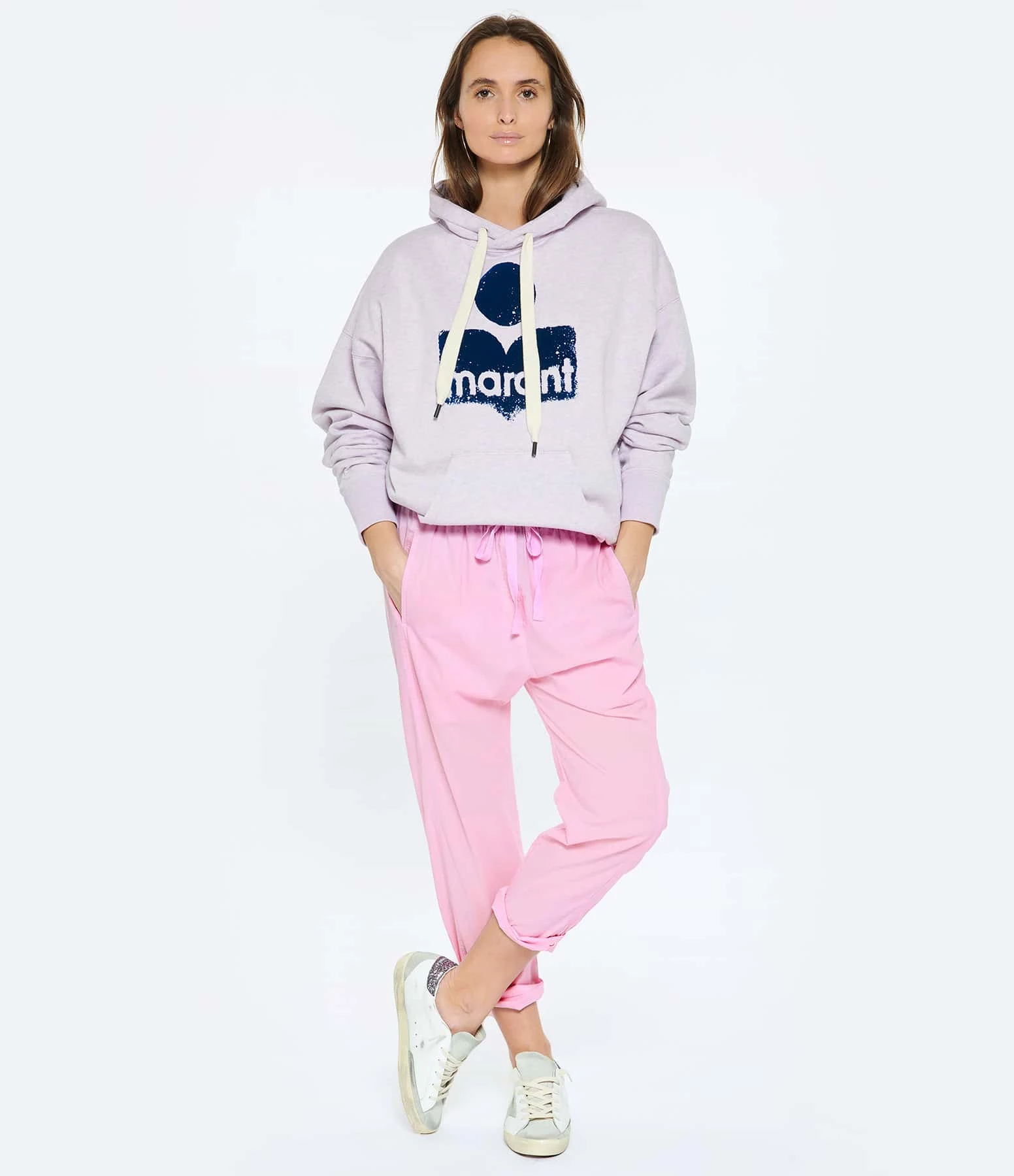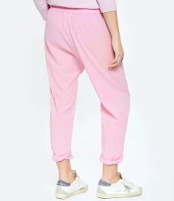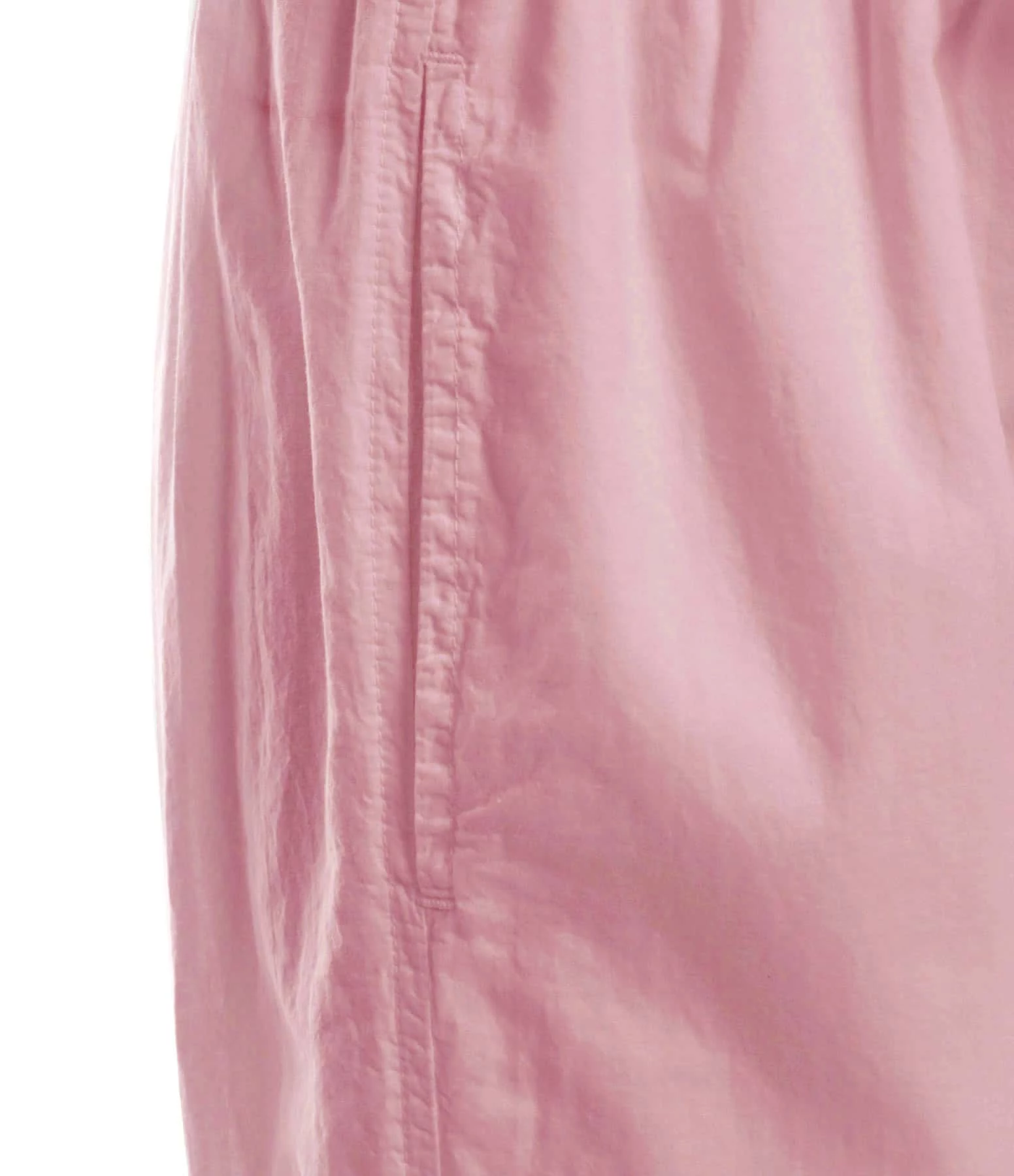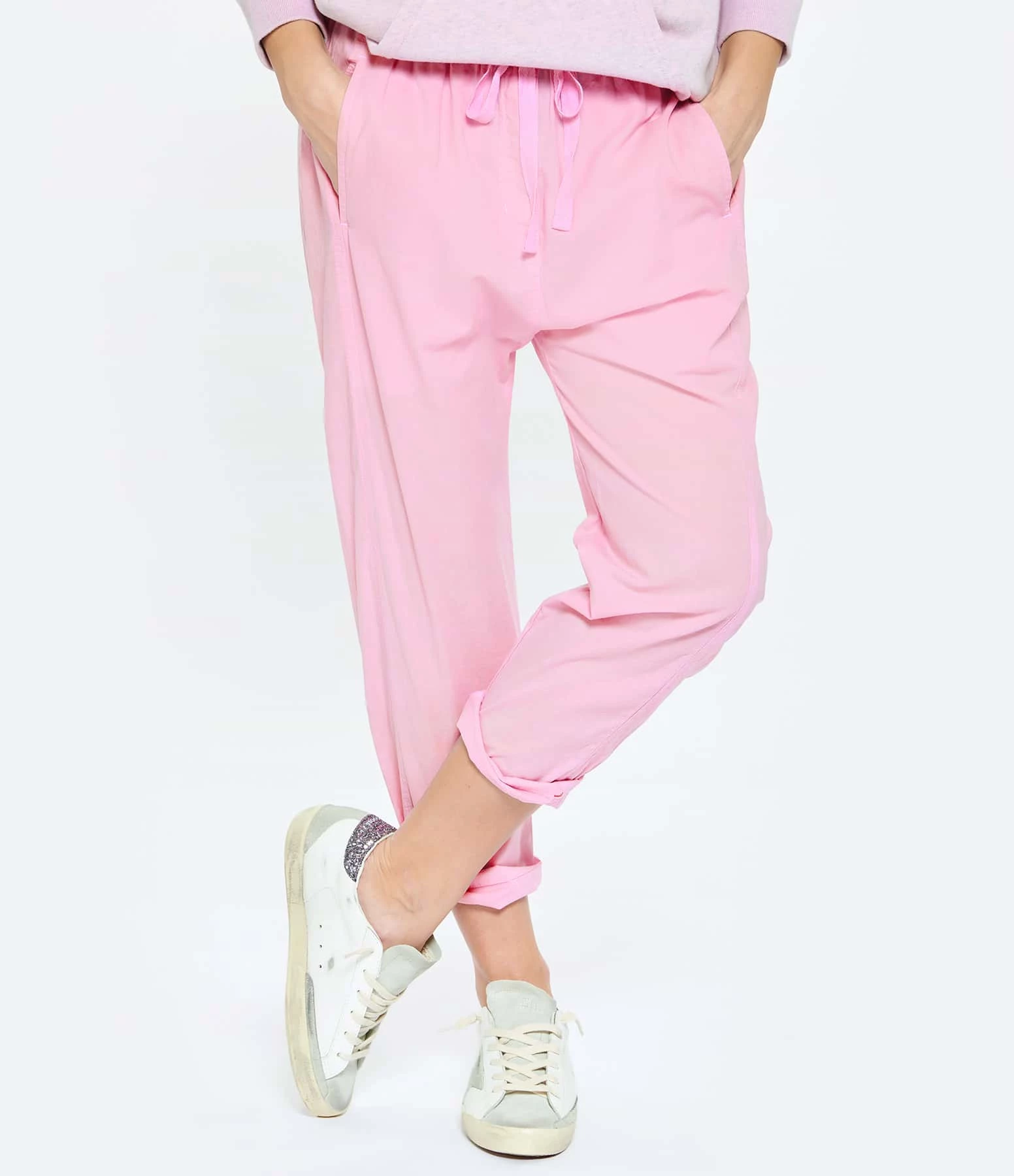 Pantalon en coton rose. Taille élastiquée avec liens de serrage. Matière fluide et fine. Deux poches italiennes. Coupe droite.