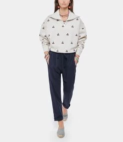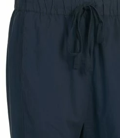 Pantalon en coton bleu marine. Taille élastiquée avec liens de serrage. Deux poches italiennes. Non doublé.