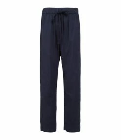 Pantalon en coton bleu. Taille élastiquée avec liens de serrage. Matière fluide et fine. Deux poches italiennes. Coupe droite.