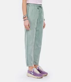 Pantalon en coton vert. Taille élastiquée avec liens de serrage. Deux poches fendues sur les côtés. Bordures vertes sur les côtés. Coupe droite.