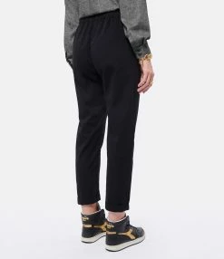 Pantalon en coton noir. Taille élastiquée avec liens de serrage. Deux poches italiennes. Coupe droite.