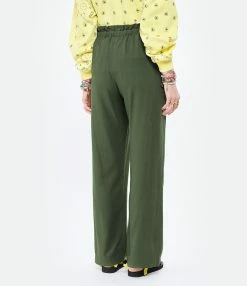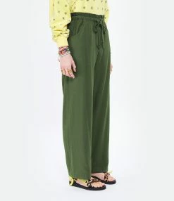 Pantalon droit en soie kaki. Liens de serrage à la taille. Deux poches cavalières. Coupe droite.