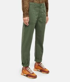 Pantalon en coton kaki. Quatre poches. Fermeture par zip. Coupe droite.