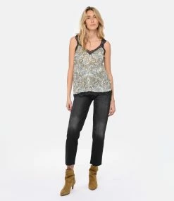 Caraco à imprimé multicolore orné de dentelle grise. Col en V. Bretelles croisées au dos. Base arrondie et dentelée.