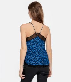 Top à imprimé léopard bleu et noir, orné de dentelle noire. Col en V. Bretelles croisées au dos. Base arrondie et dentelée.