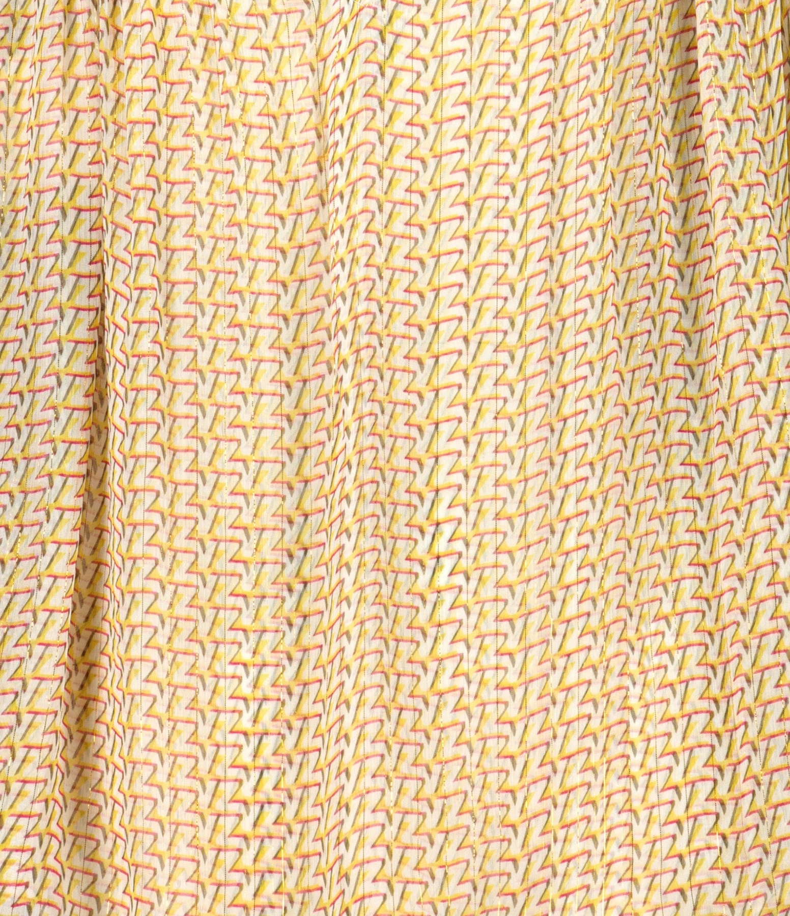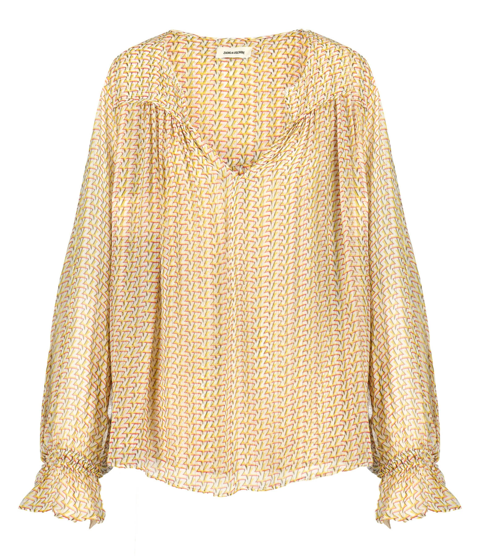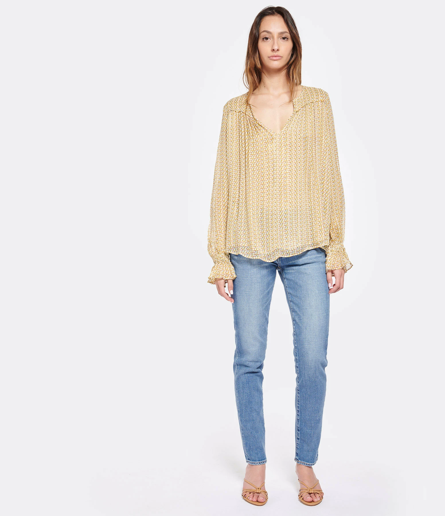 Blouse jaune monogrammée ZV. Détails de fils métalliques pailletés. Col en V. Manches longues évasées élastiquées aux poignets. Coupe droite. Base droite.