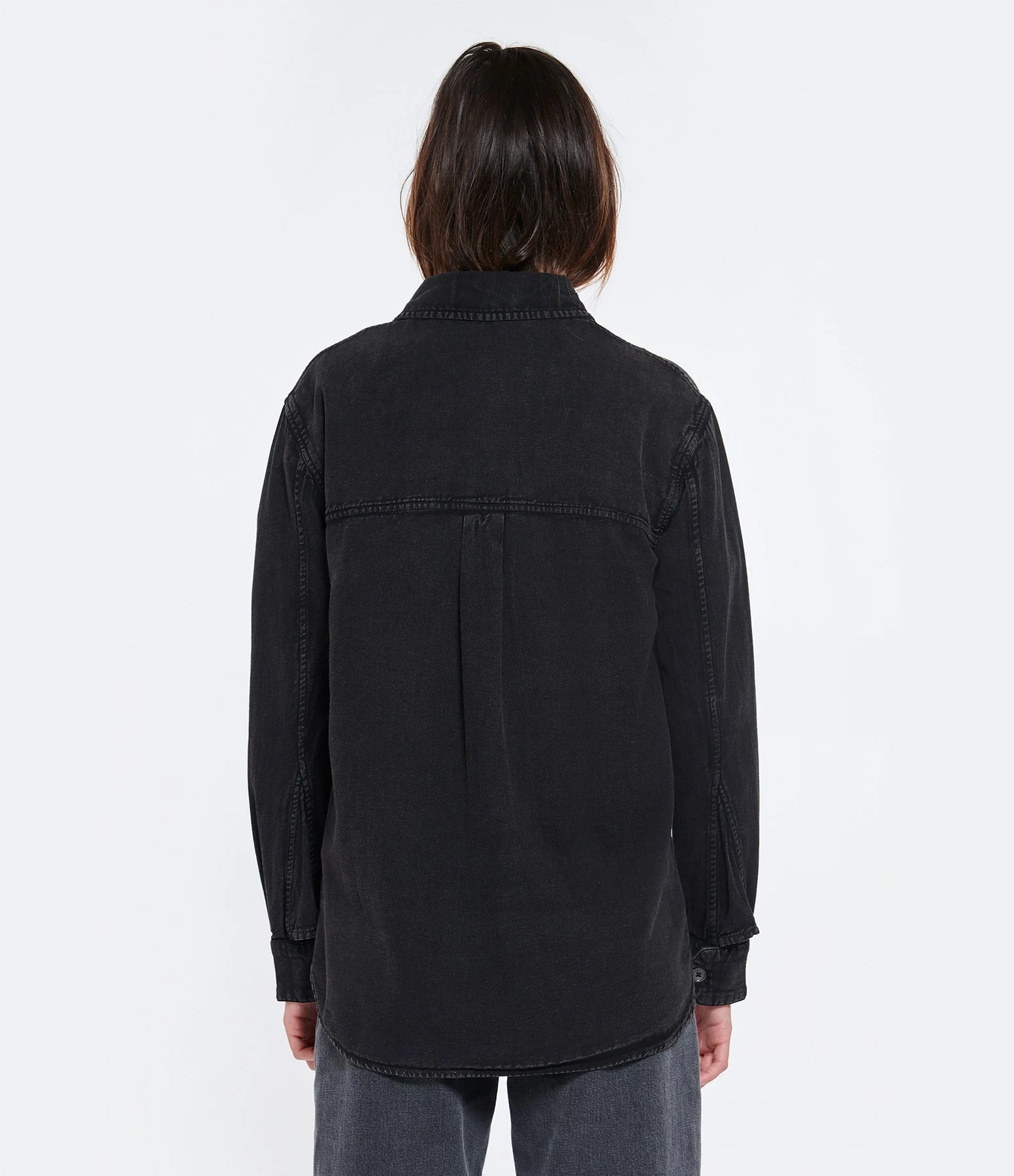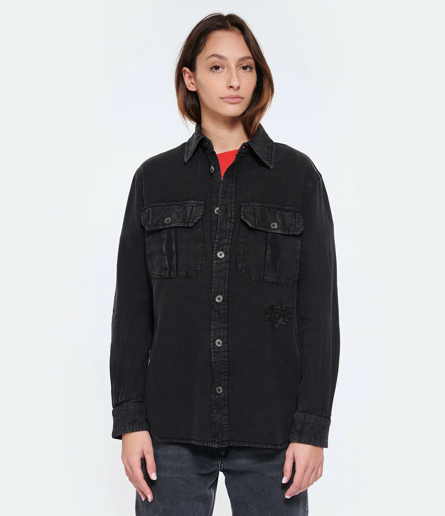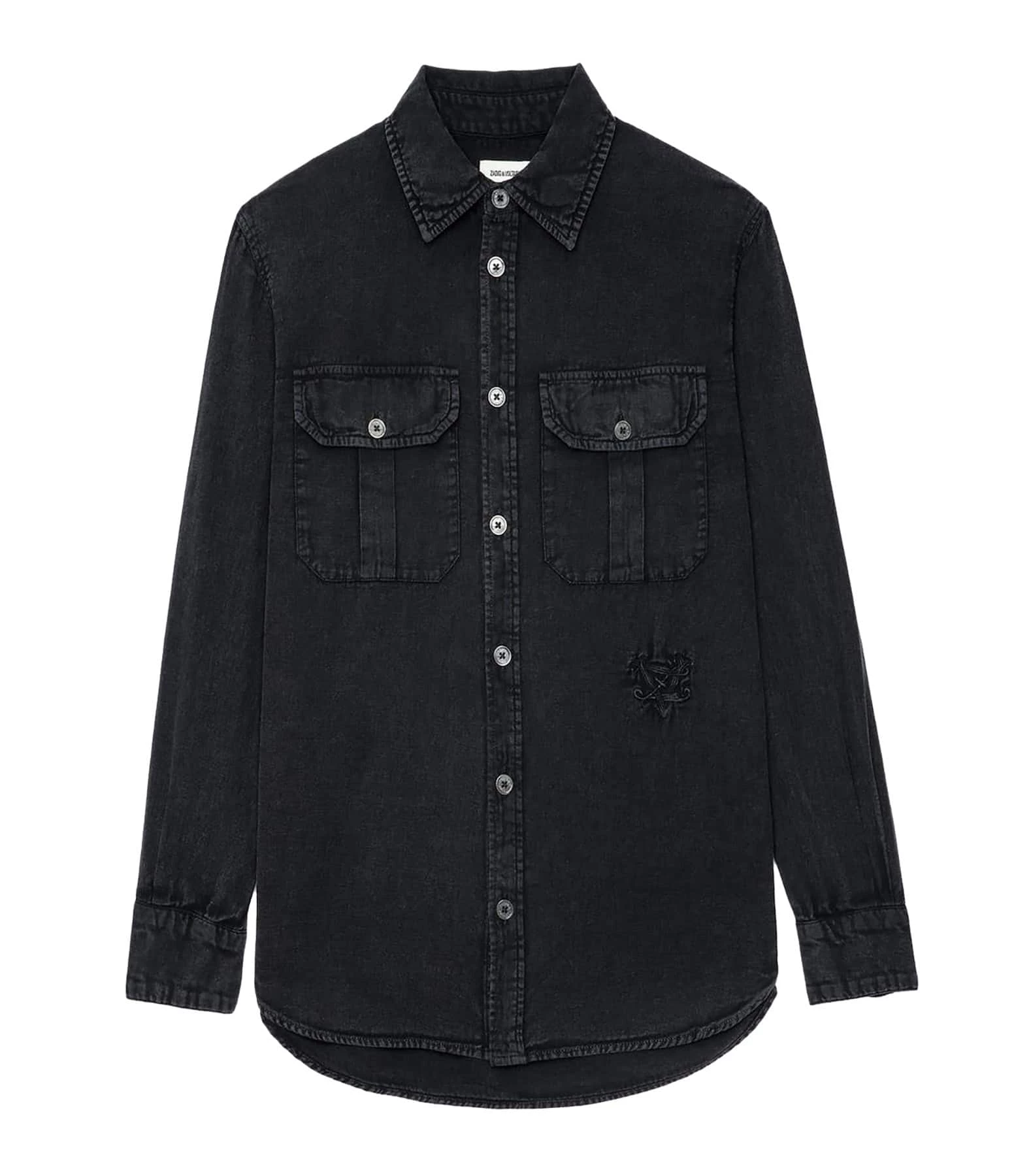 Chemise en denim de coton noir délavé. Signature ZV brodé sur le devant. Manches longues. Col chemisier. Fermeture boutonnée sur le devant. Boutons noirs mats. Deux poches à rabat niveau poitrine. Boutons aux poignet.