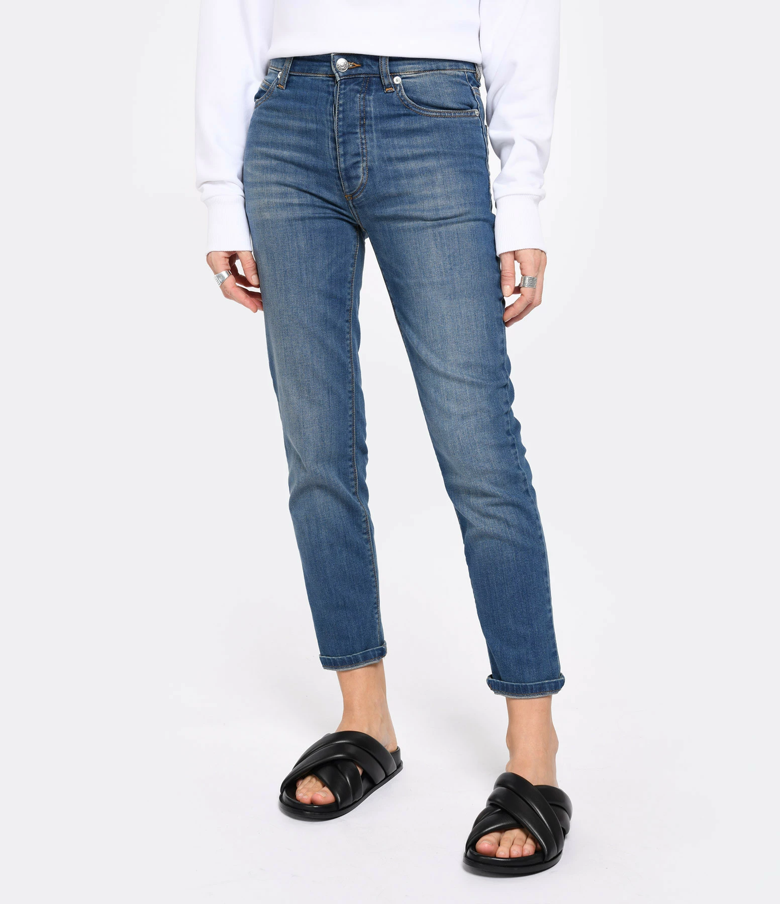 Pantalon en denim de coton bleu délavé. Braguette boutonnée. Cinq poches. Boutons métalliques avec logo gravé. Passants pour ceinture. Coupe droite. Base droite.
