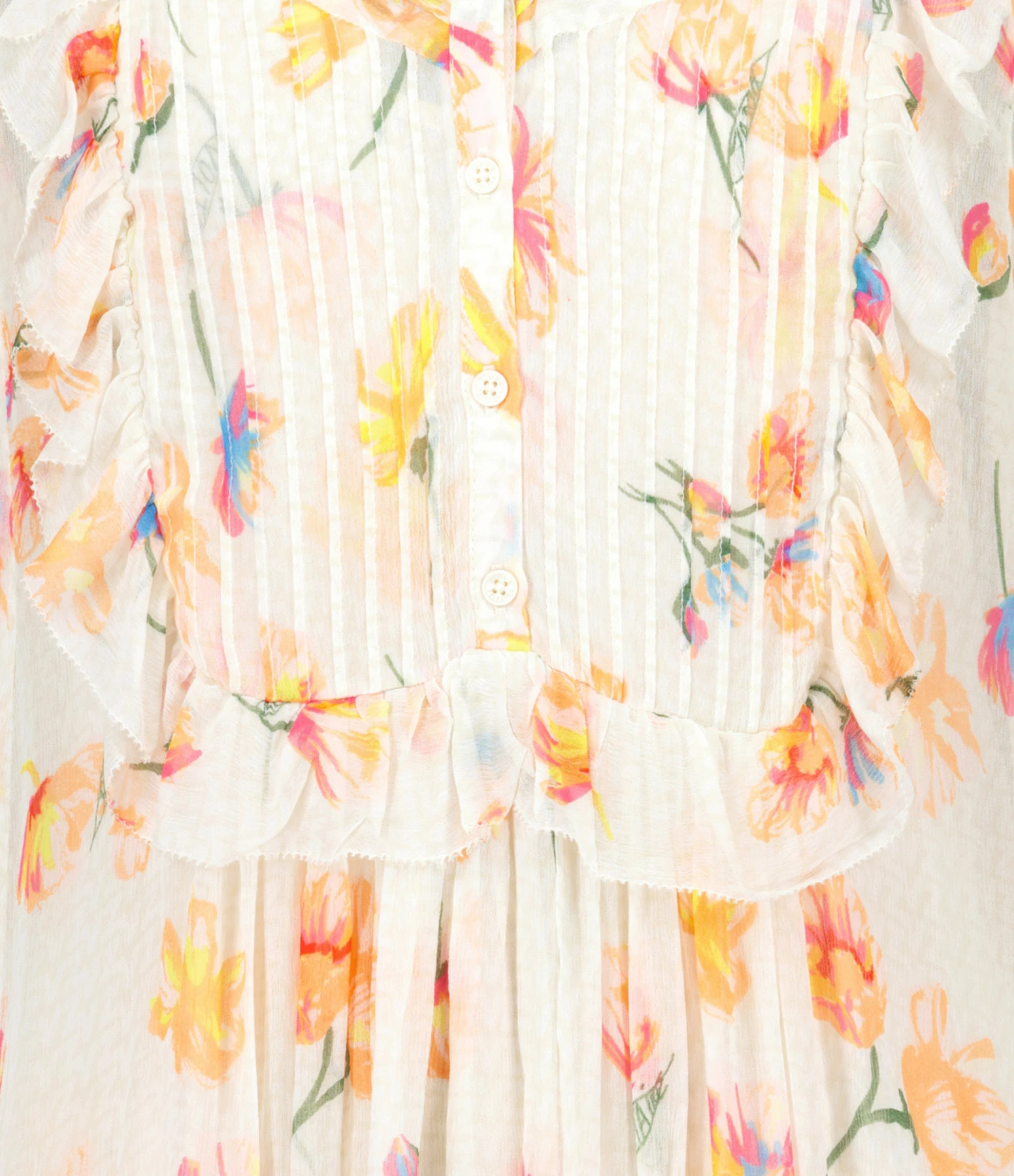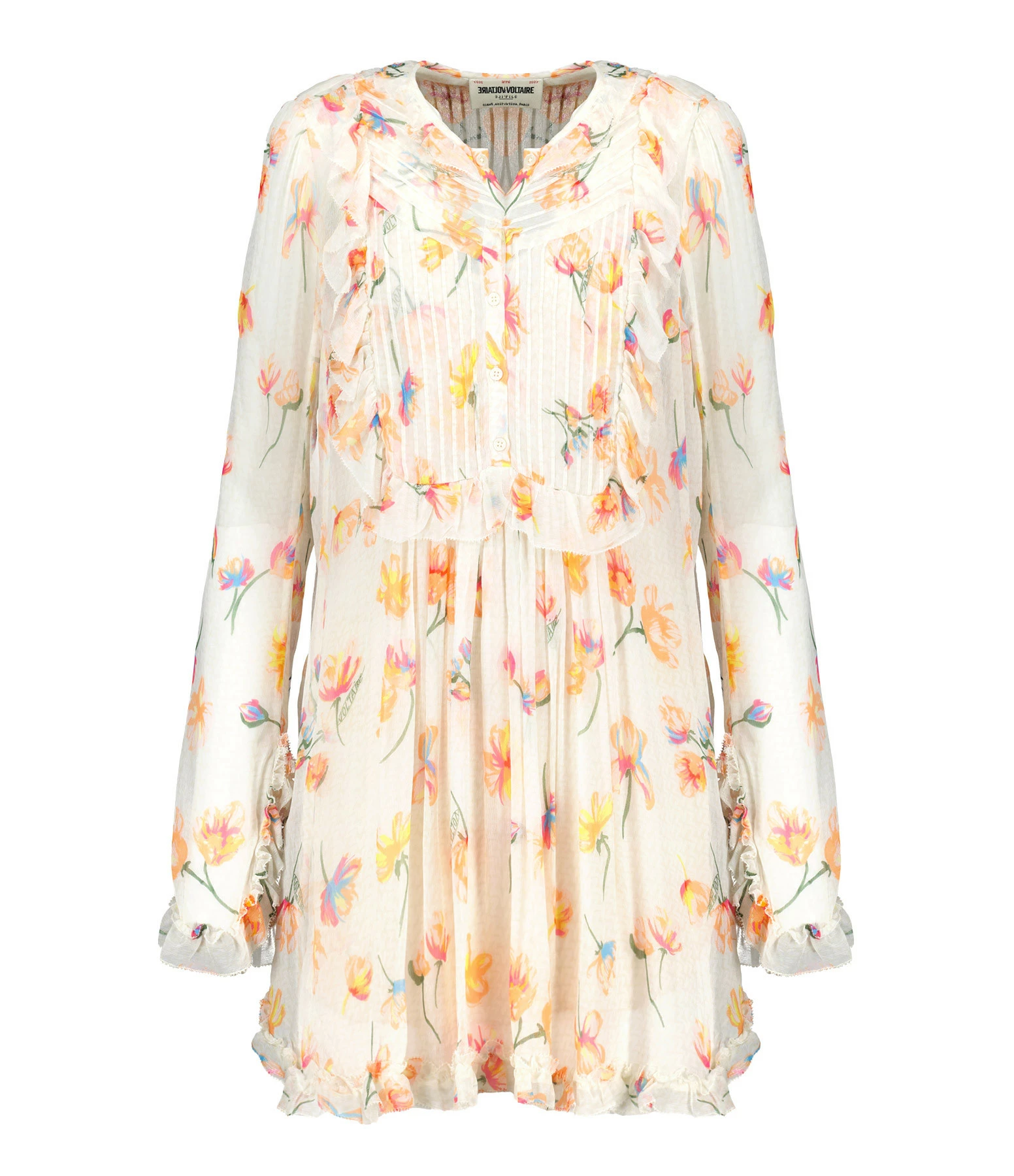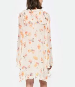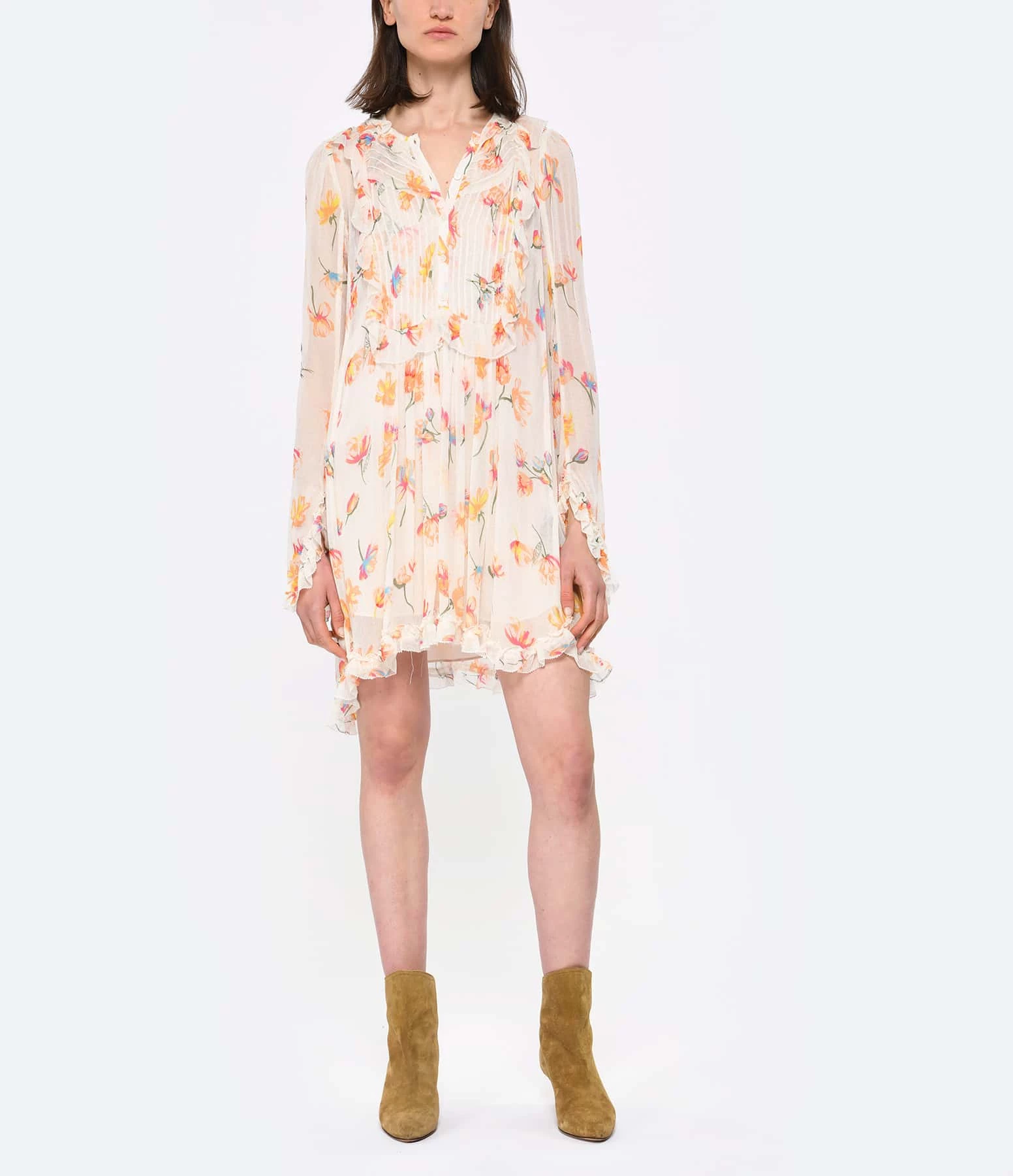 Robe fluide crème à imprimé floral multicolore. Manches longues évasées. Fermeture par boutons sur le devant. Volants au niveau du buste, des poignets, des épaules et au bas de la robe. Coupe droite. Base asymétrique. Fond de robe.