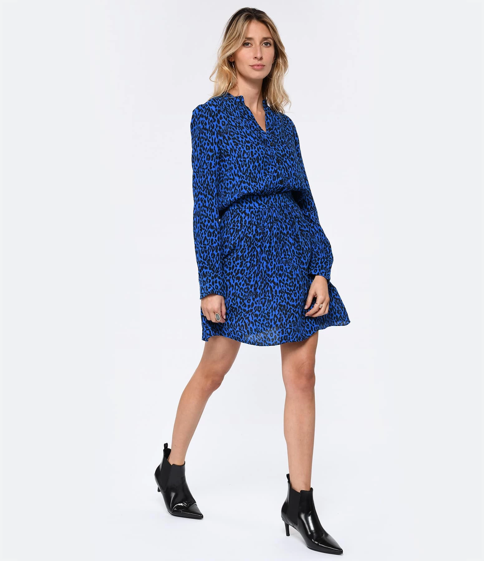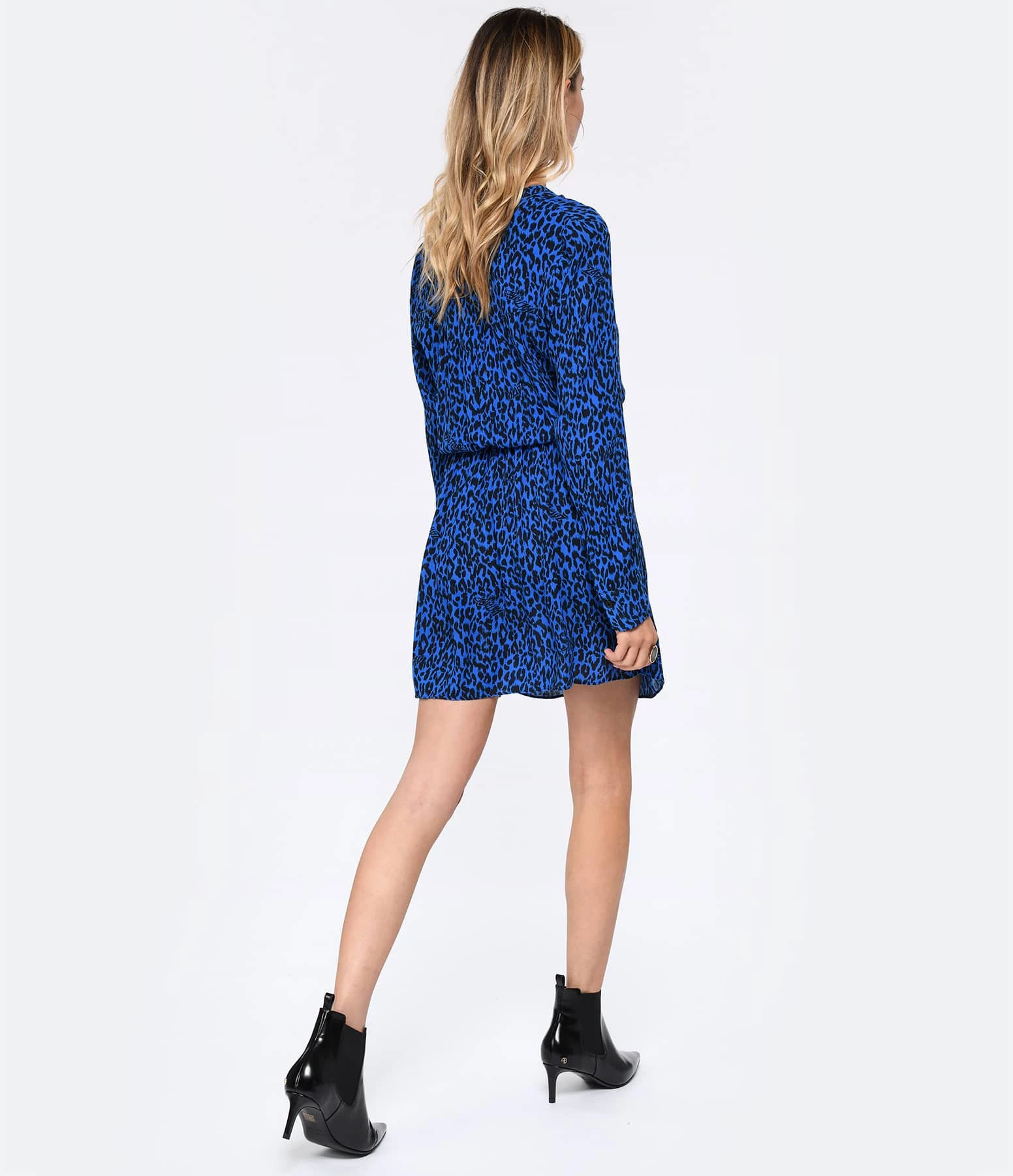 Robe courte à imprimé léopard bleu et noir. Col chemise boutonné. Manches longues avec poignets évasés et boutonnés. Resserré au niveau de la taille. Base droite.