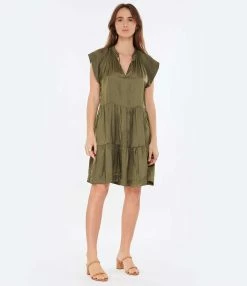 Robe courte verte. Col en V avec cordon de serrage. Manches courtes. Plissée à la taille et aux épaules. Coupe droite. Base droite.