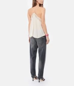 Top caraco en soie beige, orné de dentelle. Col en V. Bretelles croisées dans le dos. Base arrondie et dentelée.