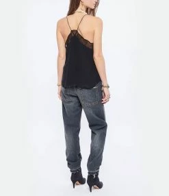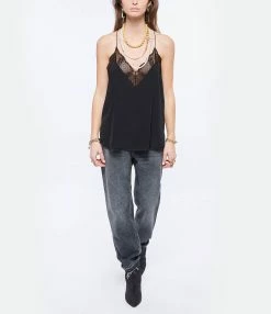 Top caraco en soie noire, orné de dentelle. Col en V. Bretelles croisées dans le dos. Base arrondie et dentelée.