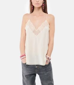 Top caraco en soie noire, orné de dentelle. Col en V. Bretelles croisées dans le dos. Base arrondie et dentelée.