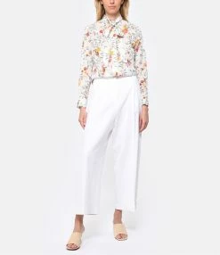 Chemise en coton à imprimé fleuri multicolore sur fond blanc. Fermeture sur le devant par boutons dorés et blancs. Manches longues resserrées aux poignets par boutons. Col officier. Coupe droite. Base arrondie.