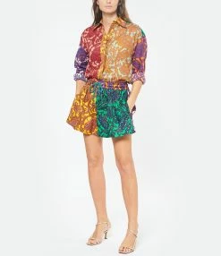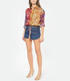 Chemise en coton à imprimé cachemire multicolore. Col chemisier. Manches longues avec fentes et poignets boutonnés. Fermeture boutonnée sur le devant. Pli creux dans le dos. Fentes latérales. Coupe ample. Base arrondie.
