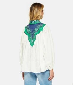 Chemise en lin ornée de motifs cachemire appliqués dans des tons vert et bleu et de perles. Col chemisier. Manches longues bouffantes. Fermeture pressionnée sur le devant. Boutons pression blancs nacrés. Dos froncé. Coupe ample. Base droite.