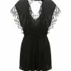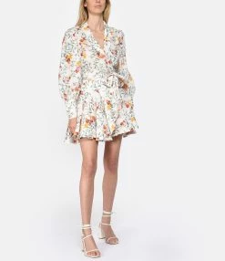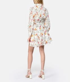 Robe courte en lin à imprimé fleuri multicolore sur fond blanc. Fermeture portefeuille à la taille par ceinture imprimée à nouer. Décolleté plongeant portefeuille en V. Manches longues resserrées aux poignets par boutons dorés et blancs. Coupe évasée. Base asymétrique.
