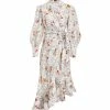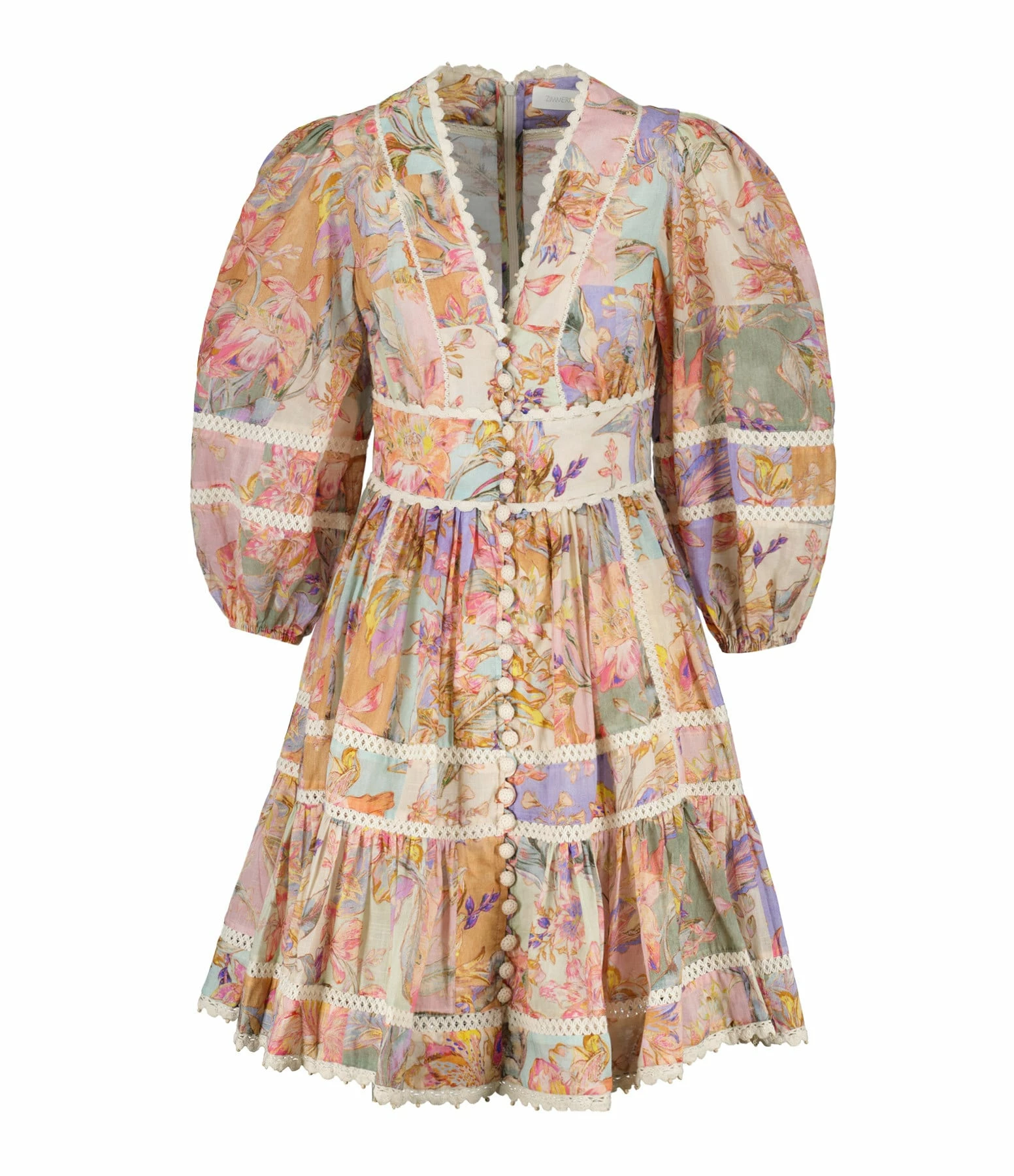 Robe courte en lin à imprimé floral multicolore. Col en V avec contour en dentelle. Manches trois-quarts bouffantes. Poignets élastiqués. Fermeture boutonnée sur le devant. Fermeture zippée invisible dans le dos. Coupe buste cintrée. Coupe jupe évasée. Base droite. Doublée en coton.