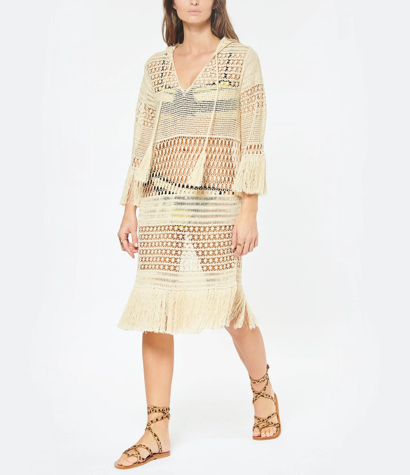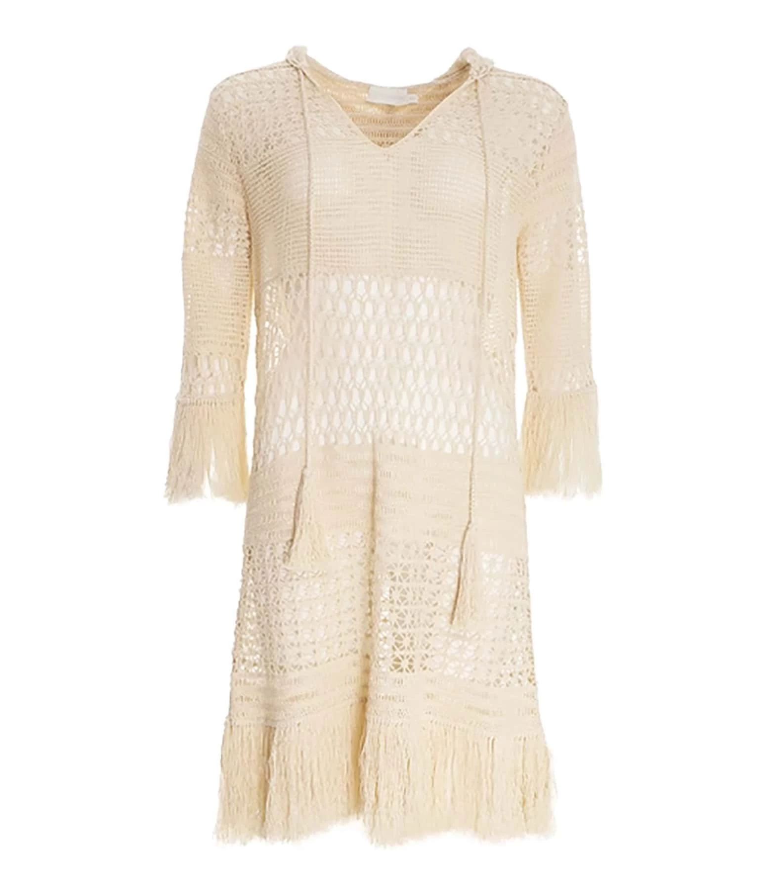 Robe de plage en crochet de coton et chanvre beige. Col en V. Capuche avec liens de serrage à pompons. Manches 7/8 avec bords frangés. Coupe droite. Base droite frangée.
