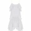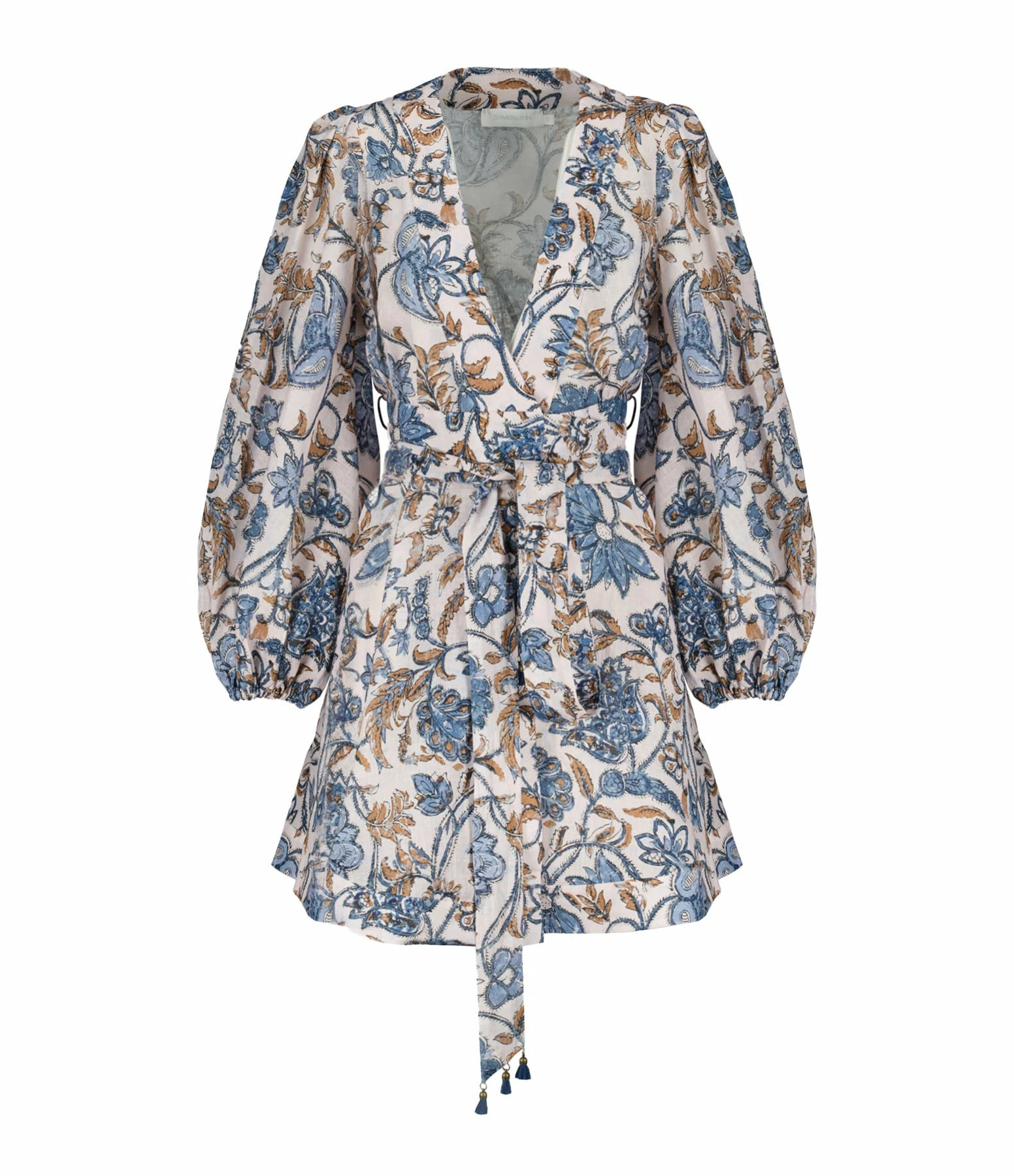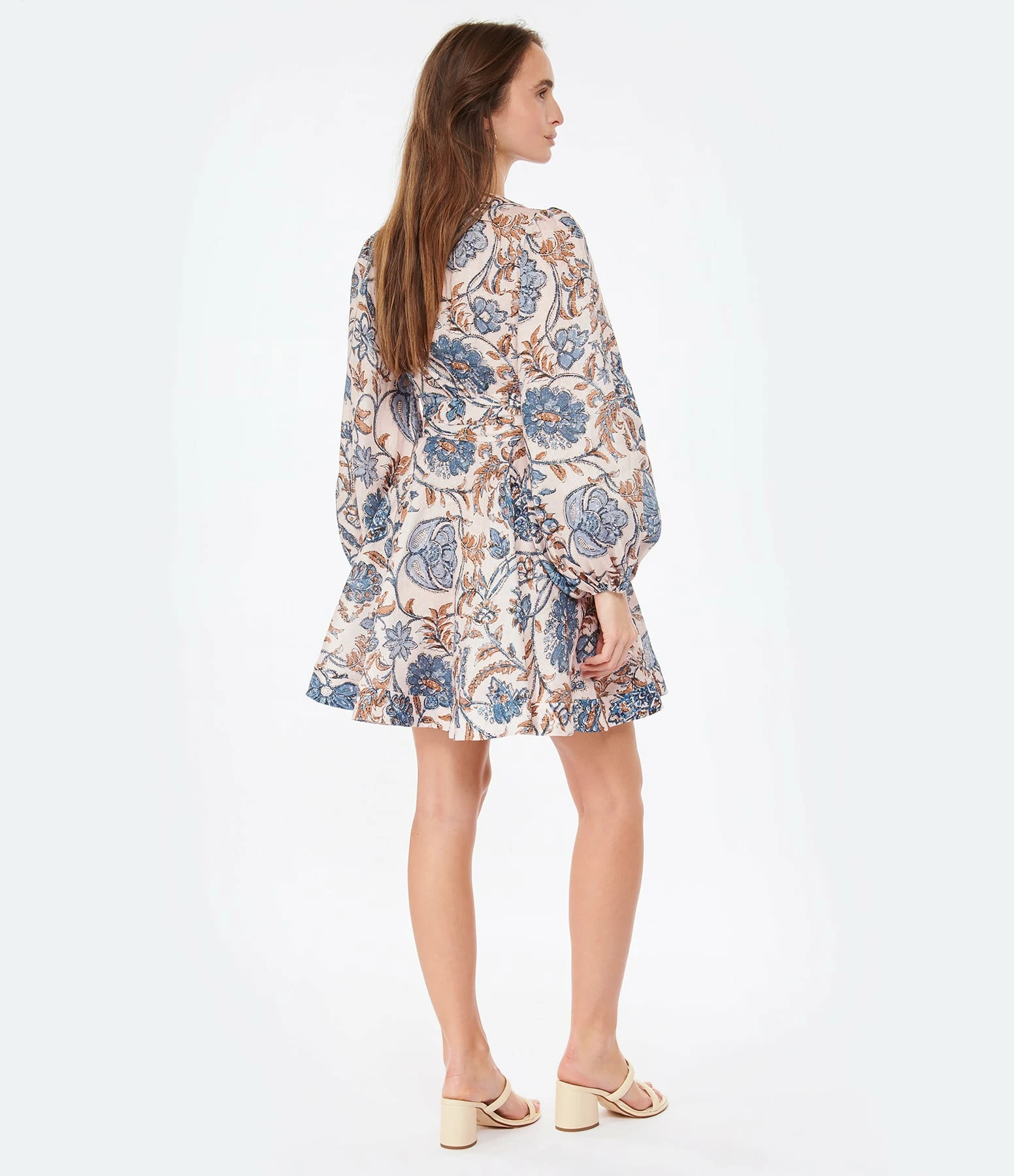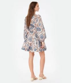 Robe courte en lin rose et bleu à fleurs. Col en V. Manches longues bouffantes à poignets élastiqués. Jupe portefeuille à nouer. Coupe évasée. Base droite.