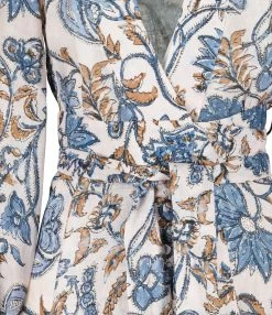 Robe courte portefeuille en soie beige crème. Encolure cache-cœur. Manches longues bishop avec poignets zippés. Taille avec passants pour ceinture assortie à nouer pour une silhouette plus ajustée. Coupe jupe évasée asymétrique. Base arrondie. Non doublée.