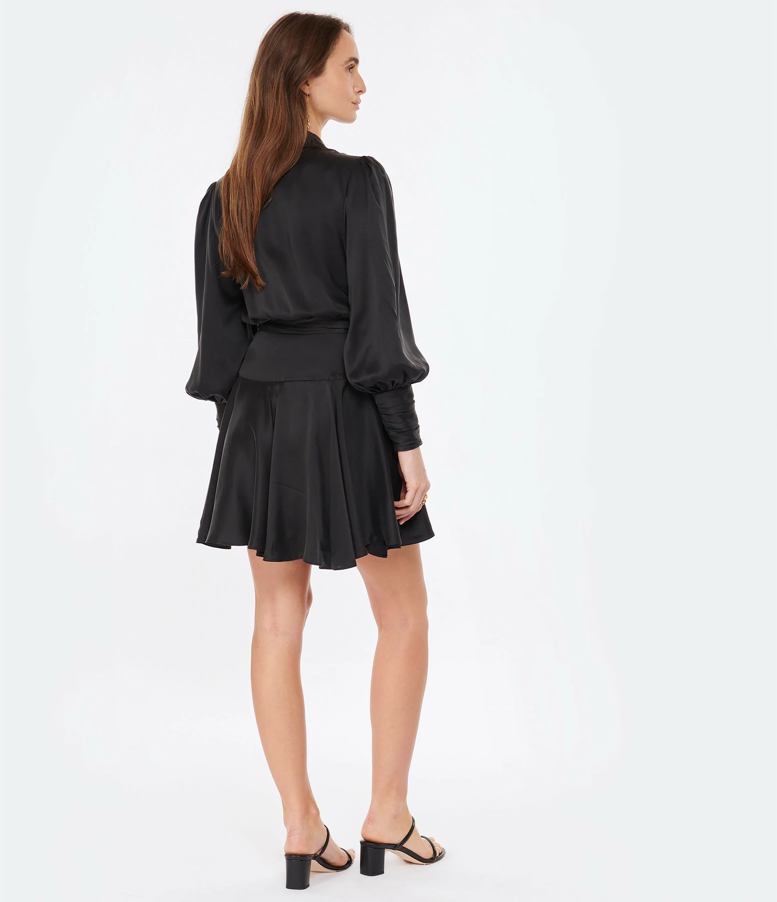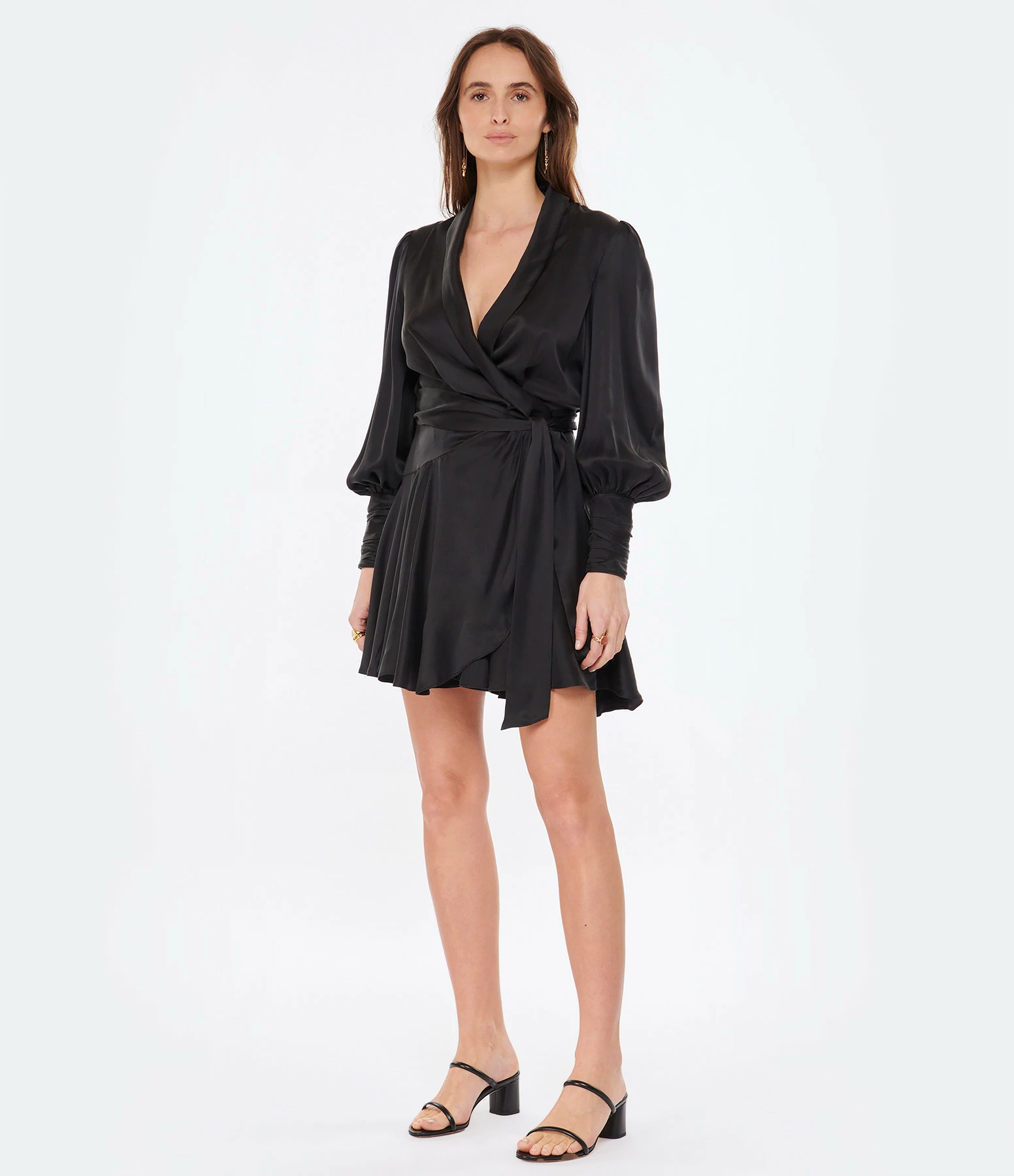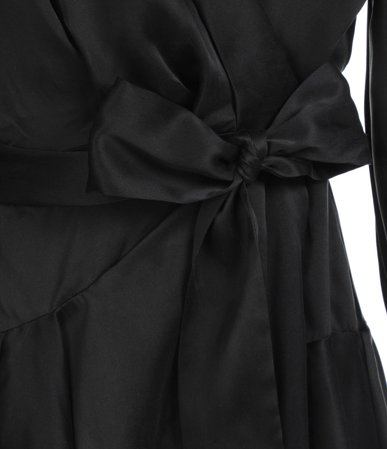 Robe courte portefeuille en soie noire. Encolure cache-cœur. Manches longues bishop avec poignets zippés. Taille avec passants pour ceinture assortie à nouer pour une silhouette plus ajustée. Coupe jupe évasée asymétrique. Base arrondie. Non doublée.