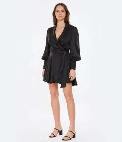 Robe courte portefeuille en soie noire. Encolure cache-cœur. Manches longues bishop avec poignets zippés. Taille avec passants pour ceinture assortie à nouer pour une silhouette plus ajustée. Coupe jupe évasée asymétrique. Base arrondie. Non doublée.