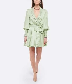 Robe courte portefeuille en soie vert clair. Encolure cache-cœur. Manches longues bishop avec poignets zippés. Taille avec passants pour ceinture assortie à nouer pour une silhouette plus ajustée. Coupe jupe évasée asymétrique. Base arrondie. Non doublée.