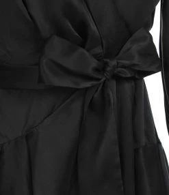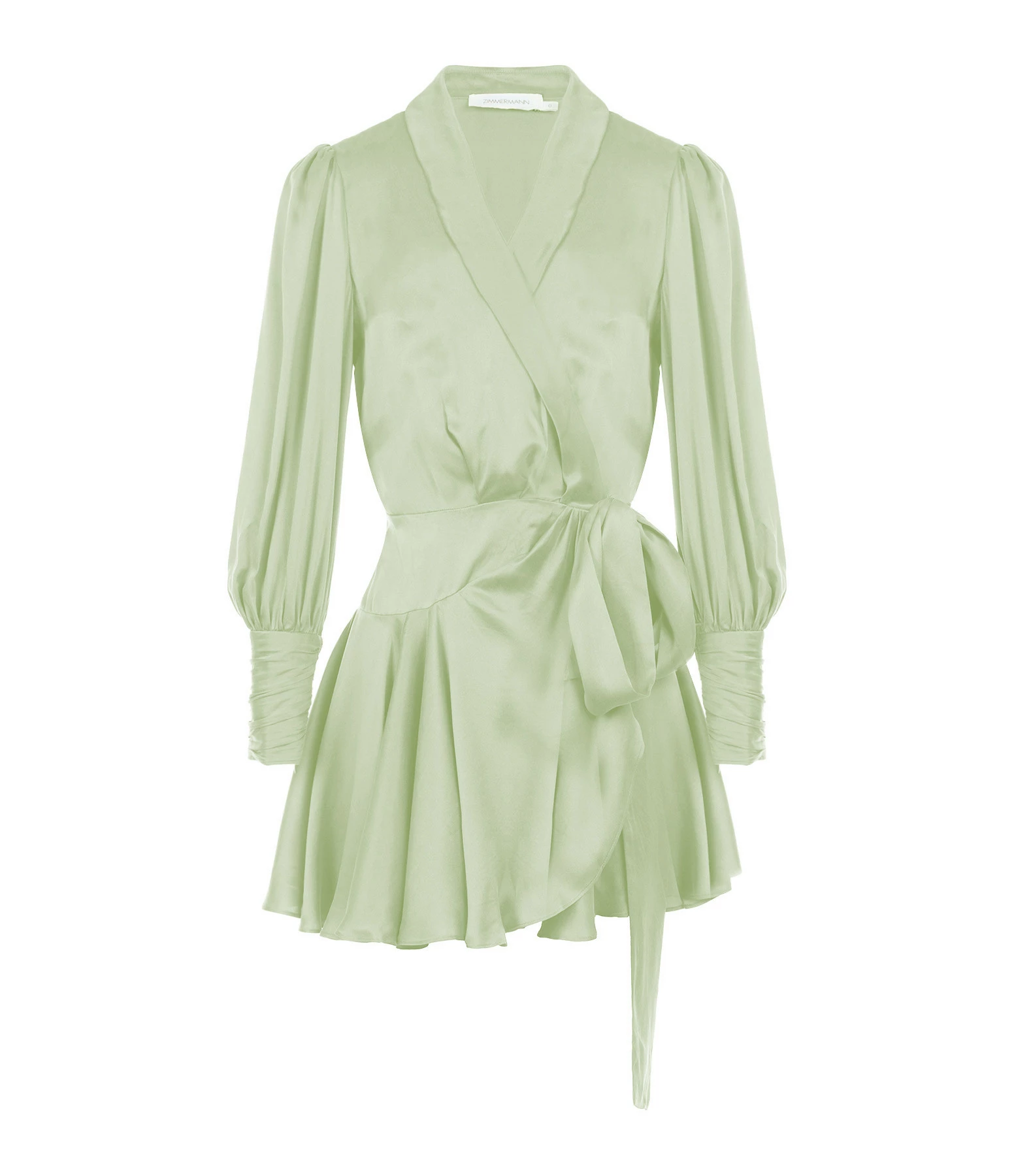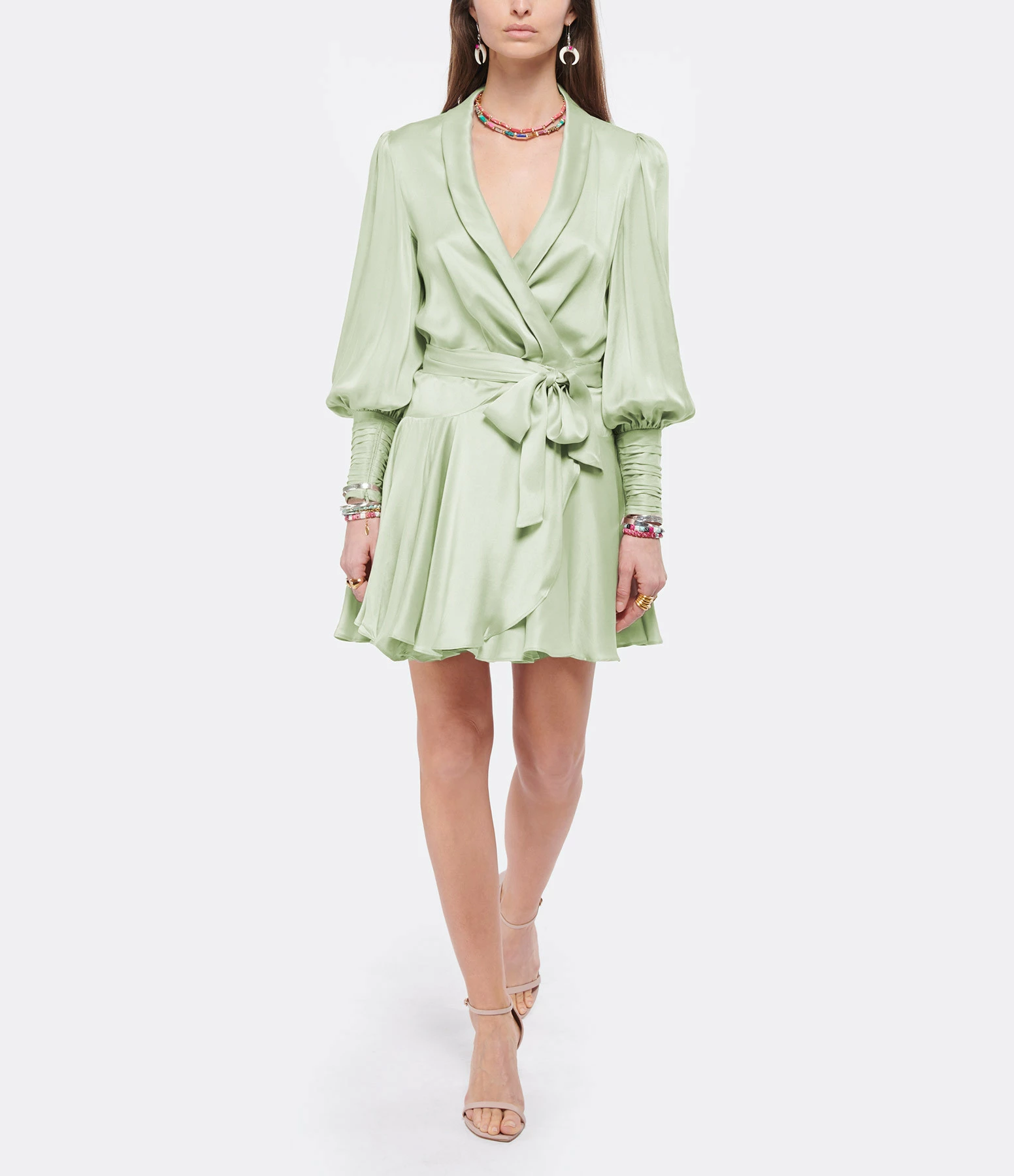 Robe courte portefeuille en soie vert clair. Encolure cache-cœur. Manches longues bishop avec poignets zippés. Taille avec passants pour ceinture assortie à nouer pour une silhouette plus ajustée. Coupe jupe évasée asymétrique. Base arrondie. Non doublée.